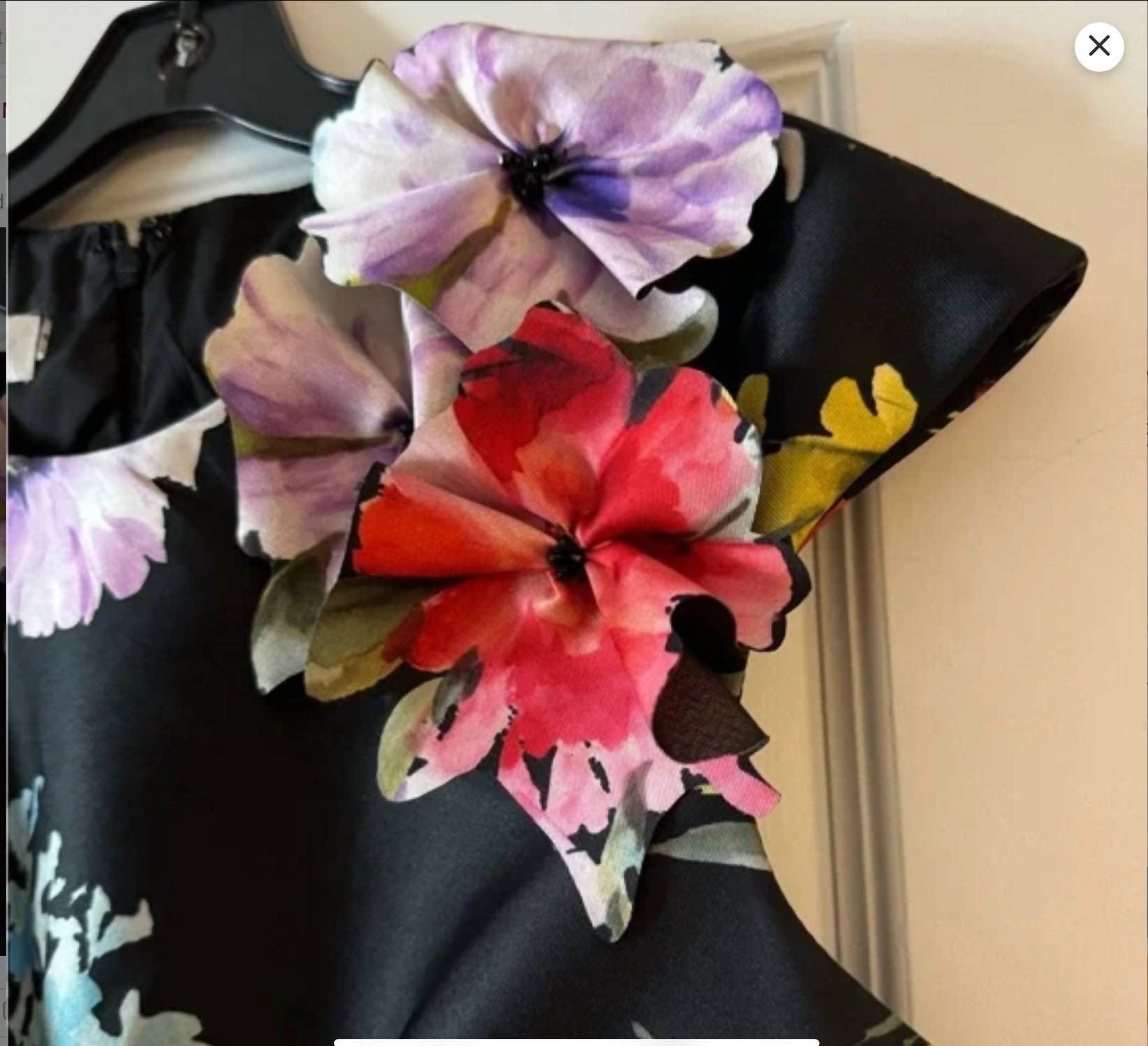 The perfect length dress does exist. Teri Jon beautiful floral print on black ground Vivid colors, pockets, belted waist if desired, zip back, worn twice in excellent condition Did I mention pockets?!