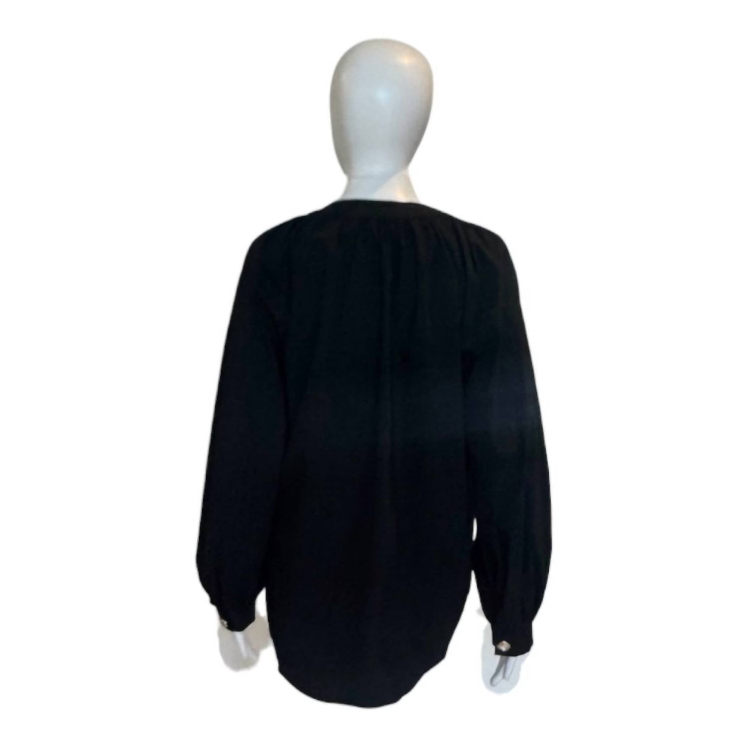 Pullover. Long sleeves. Rhinestone button pointed. Hand wash cold. Do not bleach. Iron low. Do not tumble dry.