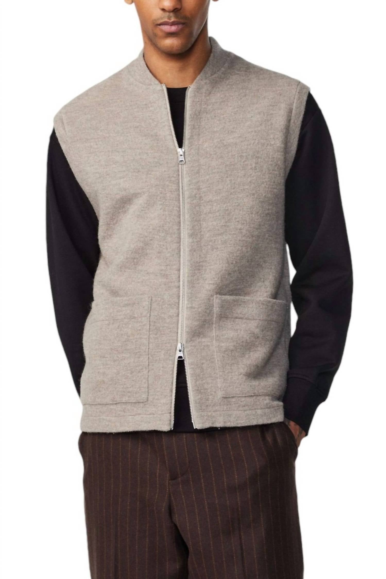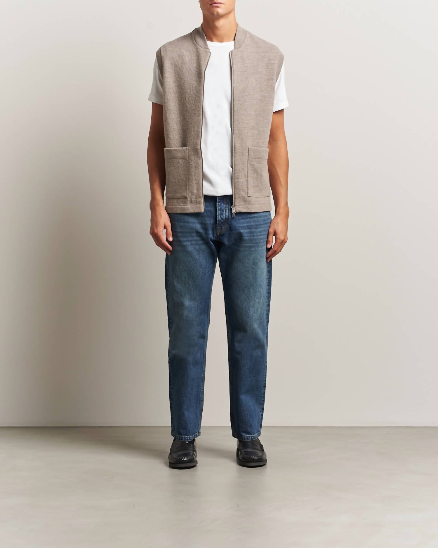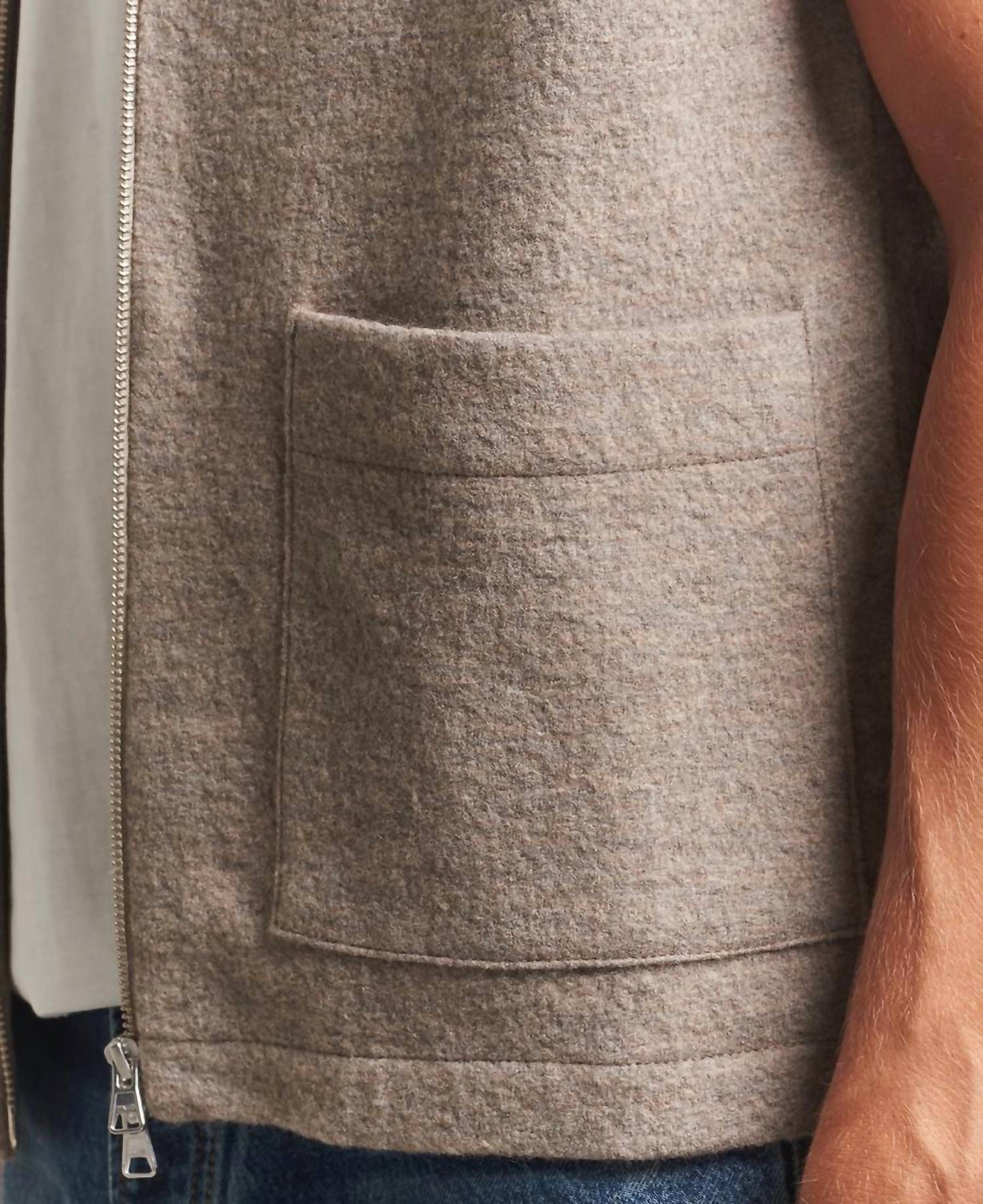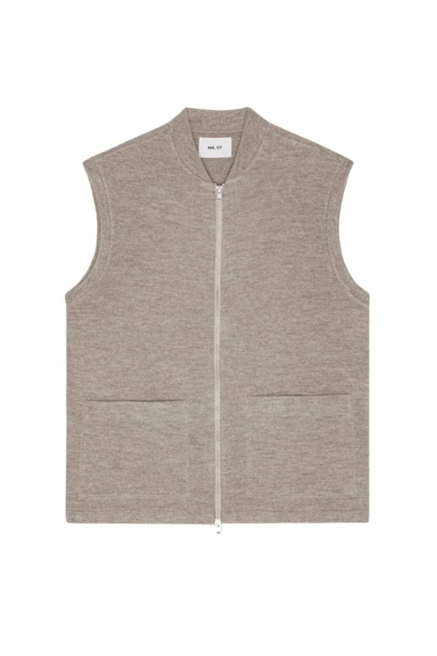 Elevate your layering game with the Sleeveless Boiled Wool Vest by NN07, designed for both style and comfort. Crafted from 100% Merino wool, this khaki beige vest offers extra coziness with a minimalist bomber collar and practical square twin pockets. Made to OEKO-TEX® Standard 100, it ensures quality while the zip closure adds a sleek finish. Care: Dry clean only. Ideal for travel and workwear trends.