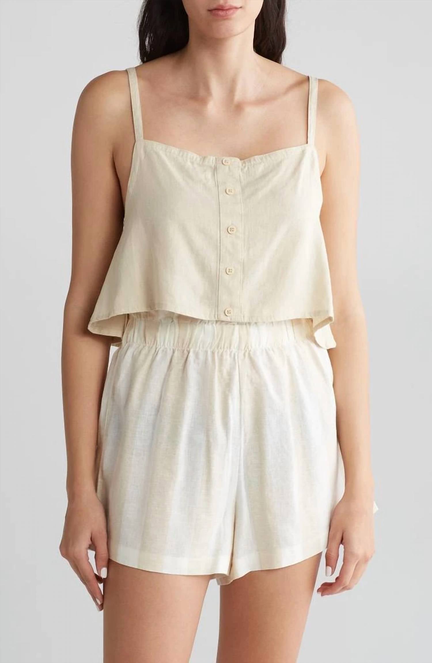 This classic tank top is perfect for layering and cute enough to wear on its own. Introducing the Linen Trapeze Tank Top by WE WORE WHAT in a versatile tan hue, perfect for your boho chic summer wardrobe. Crafted from a blend of 52% Linen and 48% Rayon, this top features delicate spaghetti straps and an open back design secured by functional buttons. Its relaxed silhouette is ideal for vacations or special occasions like Valentine's Day, offering effortless style with its square neckline and solid pattern. Closure: Button closure. Care: Hand wash and lay flat to dry.