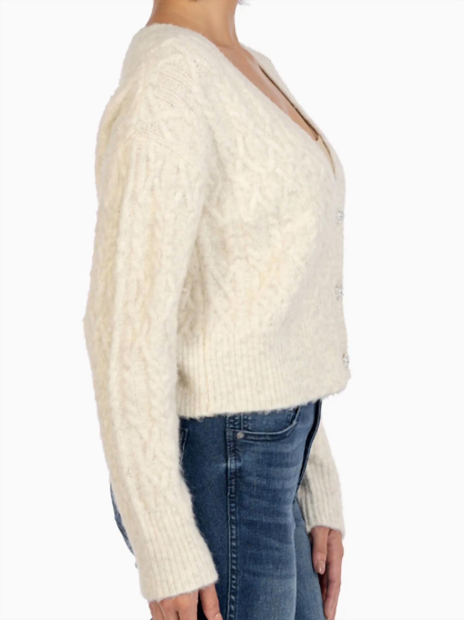 Throw this adorable cardigan over any cami or tank top. Presenting the Petra Crop Cardigan by KUT FROM THE KLOTH, an elegant ivory piece ideal for a minimalist aesthetic. Made from a luxurious blend of 68% Acrylic, 12% Polyester, 11% Nylon, 6% Wool, and 3% Spandex, this cardigan features eye-catching pearly jeweled buttons. Designed in a textured pattern, it is perfect for spring occasions like a dinner party. For care, hand wash and line dry to maintain its softness. True to size fit with model wearing a size small.