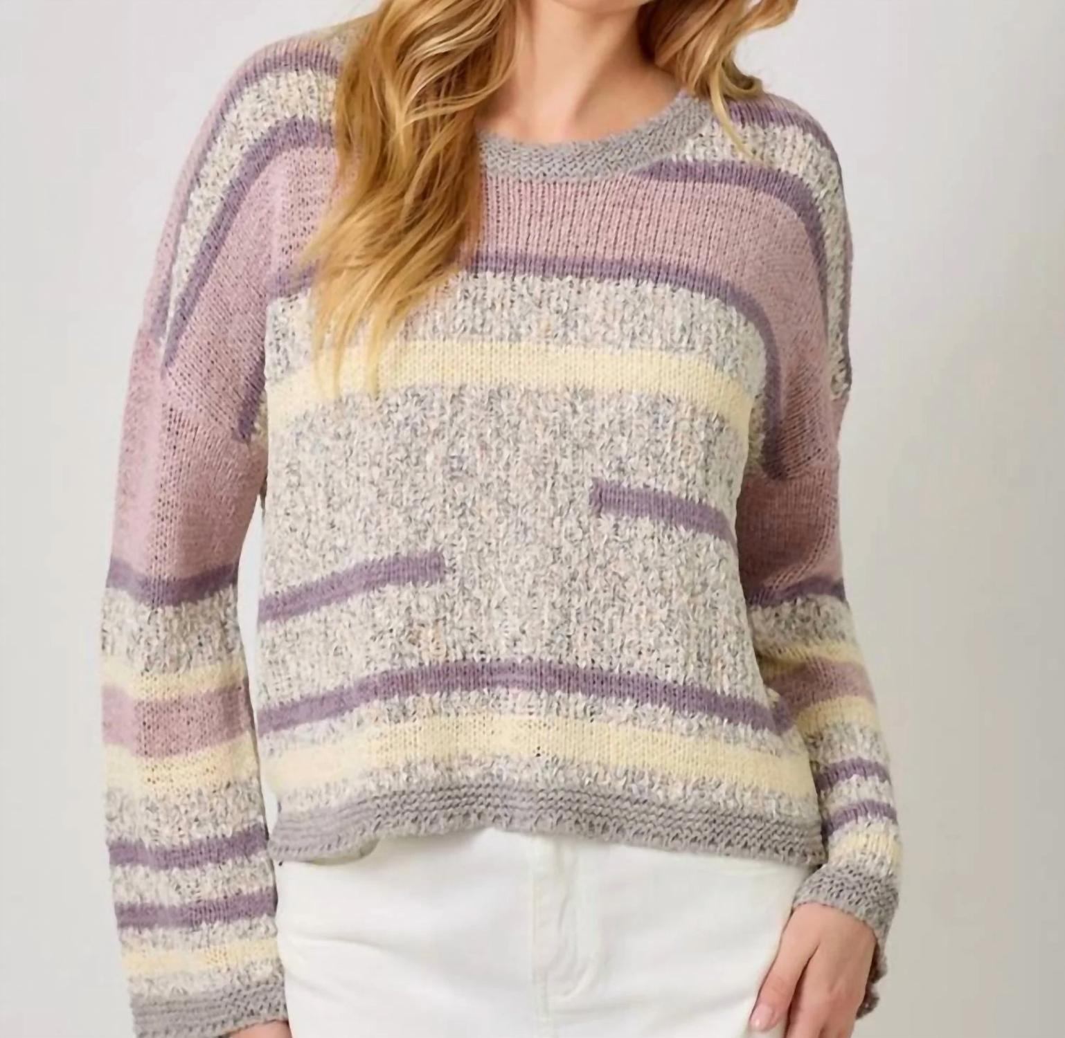 This cardigan will be a sweater-rotation favorite. Introducing the Women's Multicolor Stripe Sweater by Mystree, a streetwear-inspired fall essential perfect for your vacation wardrobe. This cardigan boasts a long sleeve design with a textured pattern, complemented by a crewneck silhouette for a cozy yet chic look. Made for easy wear, it features a convenient pull-on closure, eliminating the need for pockets. Though care instructions are not available, its versatile design and vibrant hues promise to elevate your seasonal outfits.