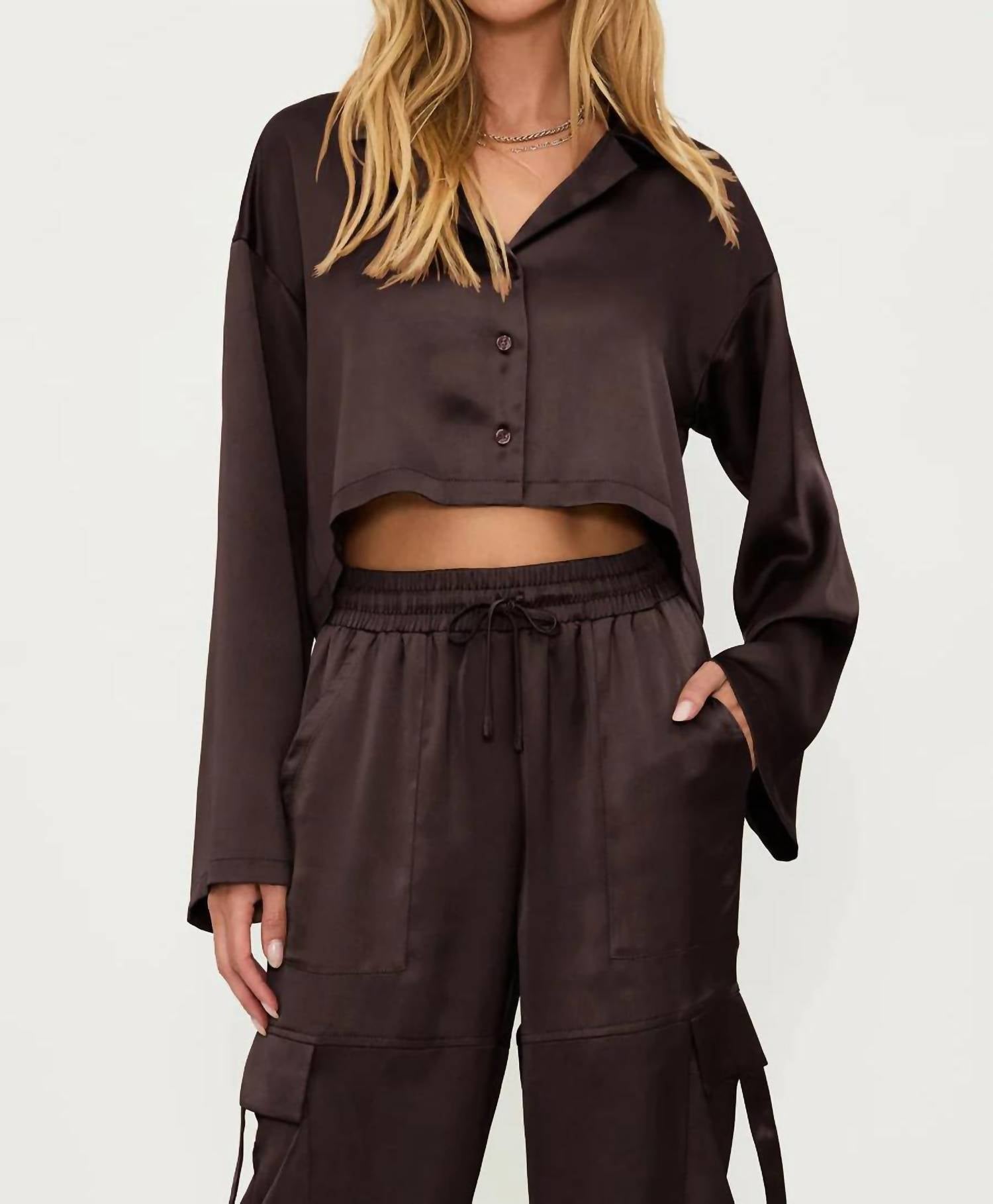 Pair this crop top with your favorite high-waisted jeans or maxi skirt. Introducing the Vella Long Sleeve Top by Beach Riot, a modern statement piece in a glossy brown satin finish. This solid, cropped shirt features a spread collar and is tailored with a front button closure, perfect for a minimalist look. Made from 100% Polyester, it combines elegance with a touch of trend. Care for this stunning piece by hand washing and drying flat. Runs small, model wears a size small.