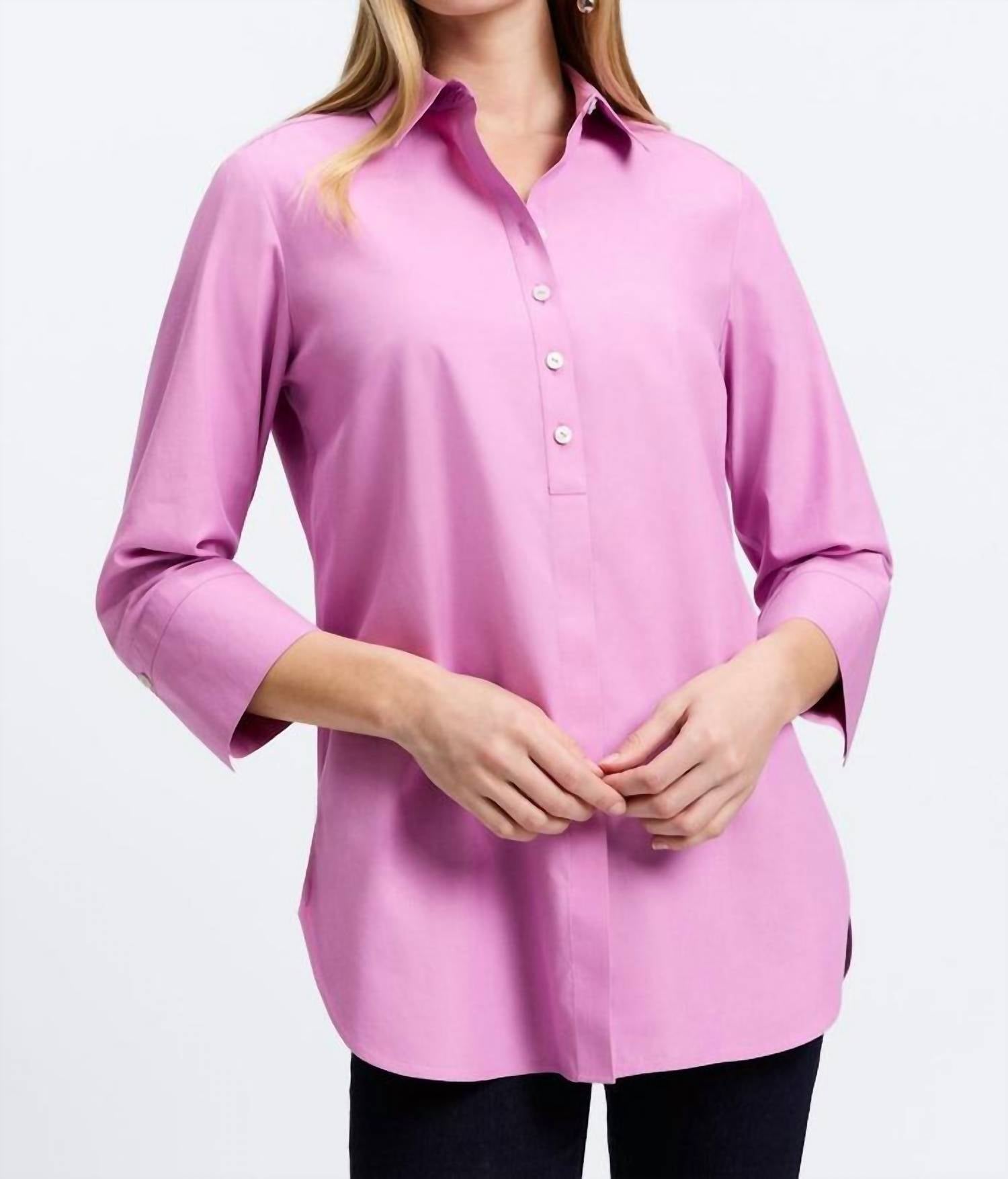 Embrace the versatility of this tunic-style blouse, expertly crafted for seamless layering or perfect to wear on its own. Its detailed design and comfortable fit make it a perfect addition to any closet. Introducing the Madison No Iron Pinpoint 3/4 Sleeve Tunic by Foxcroft, a refined choice in a delicate Rose Quartz shade for modern women. This blouse features three-quarter sleeves with button cuffs and a stylish point collar. Crafted from 100% cotton, the garment offers a 28.5" center back length on a size 6 and showcases a rounded hem. Experience the convenience of its button closure and effortless care with machine wash cold and tumble dry low instructions, making it flawless without ironing.