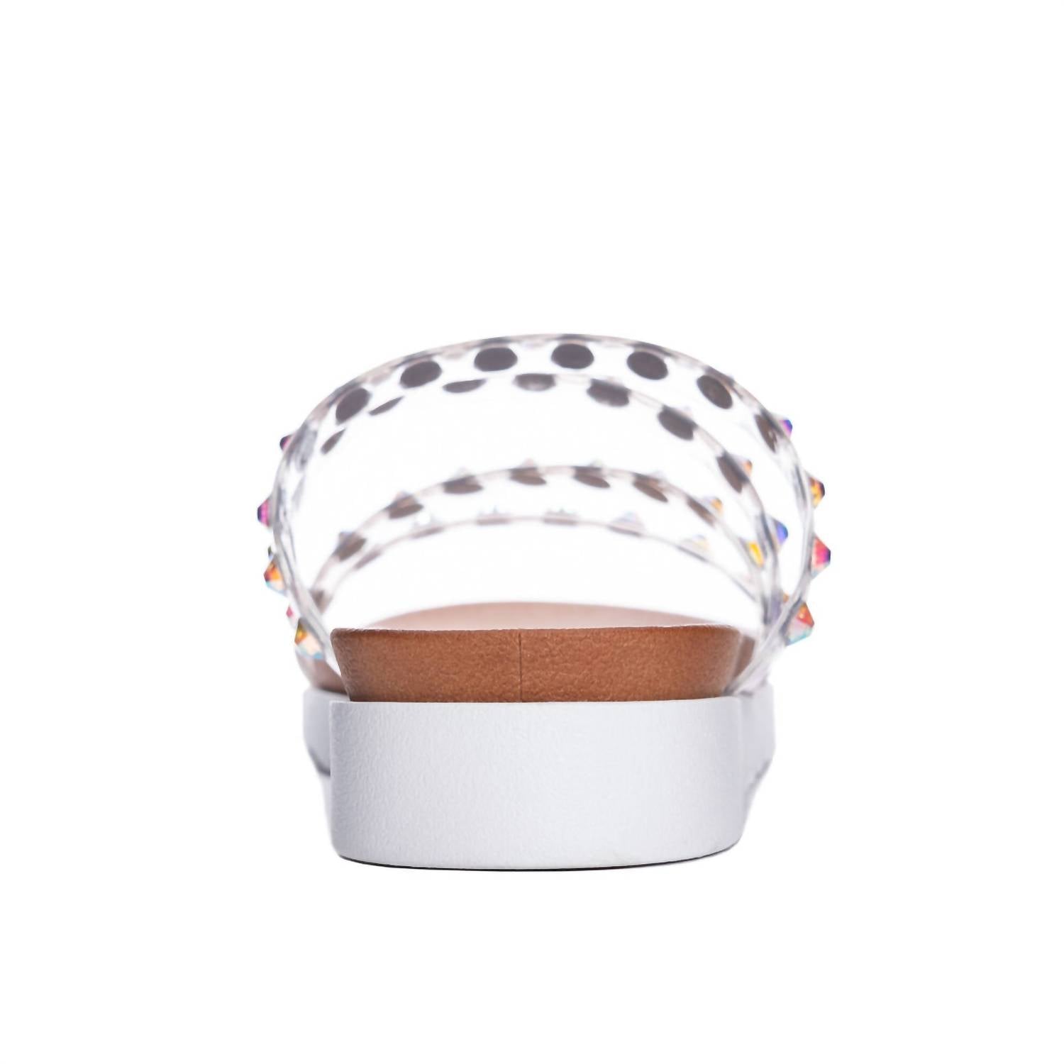 Flowy dresses, cropped pants, and even jumpsuits... this sandal works with them all! Step into vibrant style with the Women's Coral Flat Sandal by CHINESE LAUNDRY, designed to impress with its iridescent finish. These slide sandals feature slender, translucent zig-zagging straps adorned with gemstone spikes, complemented by an open round toe for a chic look. Crafted with a contrasting white, razor-lugged flat sole, these sandals ensure comfort and a touch of edge to any ensemble. Ideal for those sunlit days or starry nights, simply slip them on and let your shoes do the shining.