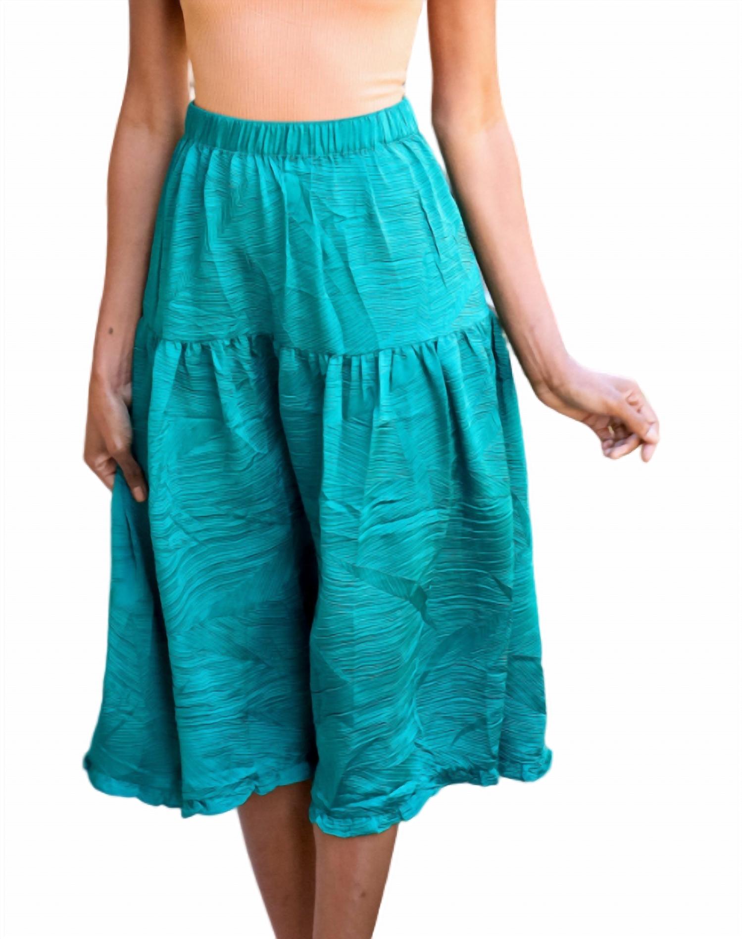 Emerald Green Crinkled Texture Elasticized Waist Tiered Midi Length Skirt. This midi skirt is suitable for any occasion. It features a midi length, a back elastic gathered waistband, and pockets. It is lined for added comfort. The fabric is ultra-soft. Material: 95% cotton, 5% elastane.