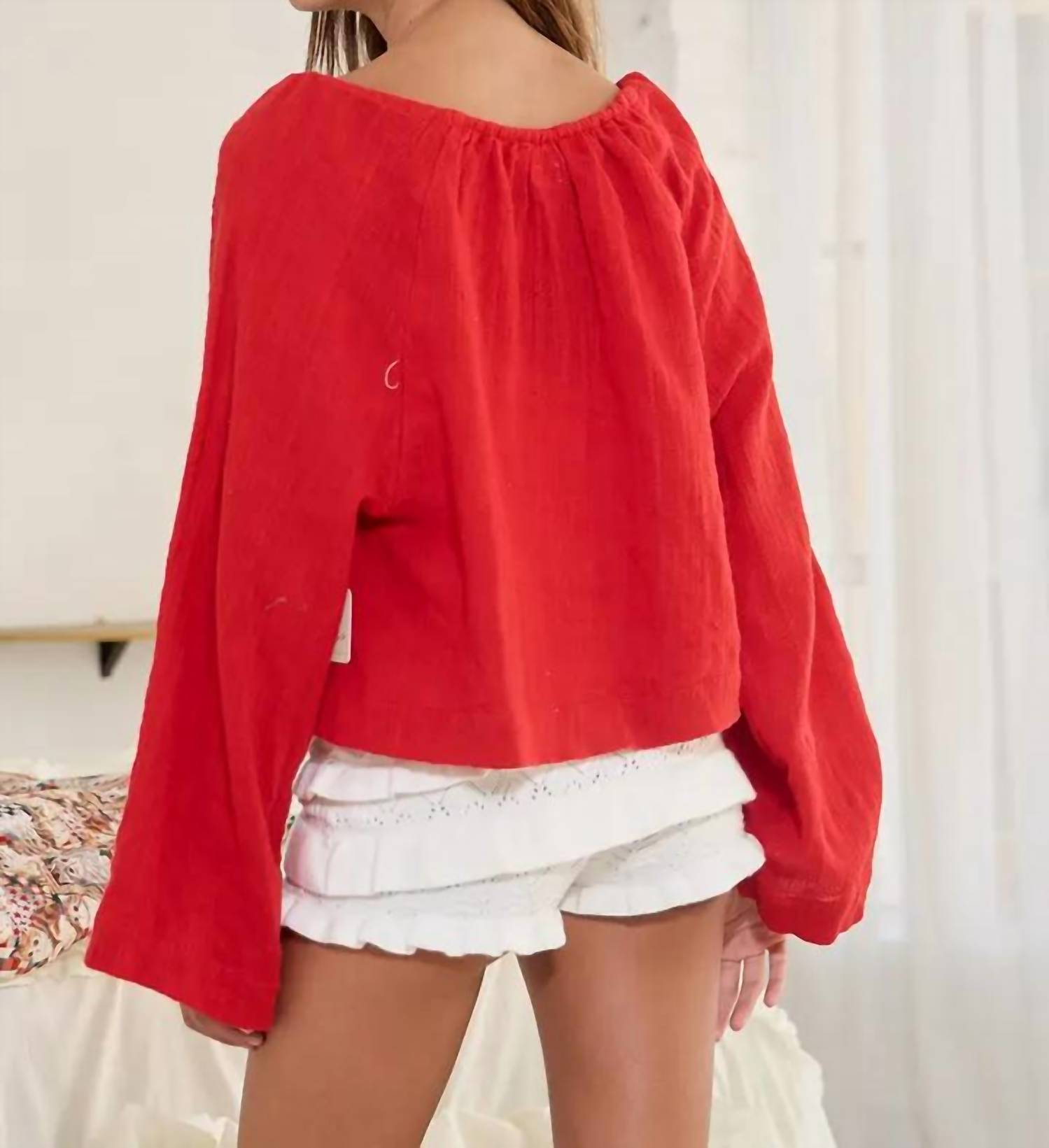 A versatile blouse that works from desk to dinner! Embrace a touch of Boho Chic with the Tie Front Blouse by BUCKETLIST, a vibrant red addition perfect for a summer vacation or a romantic Valentine's Day. Featuring a solid pattern and long sleeves, this blouse is made with a viscose blend for breezy comfort. Closure: Tie closure. Care: Hand wash and line dry.