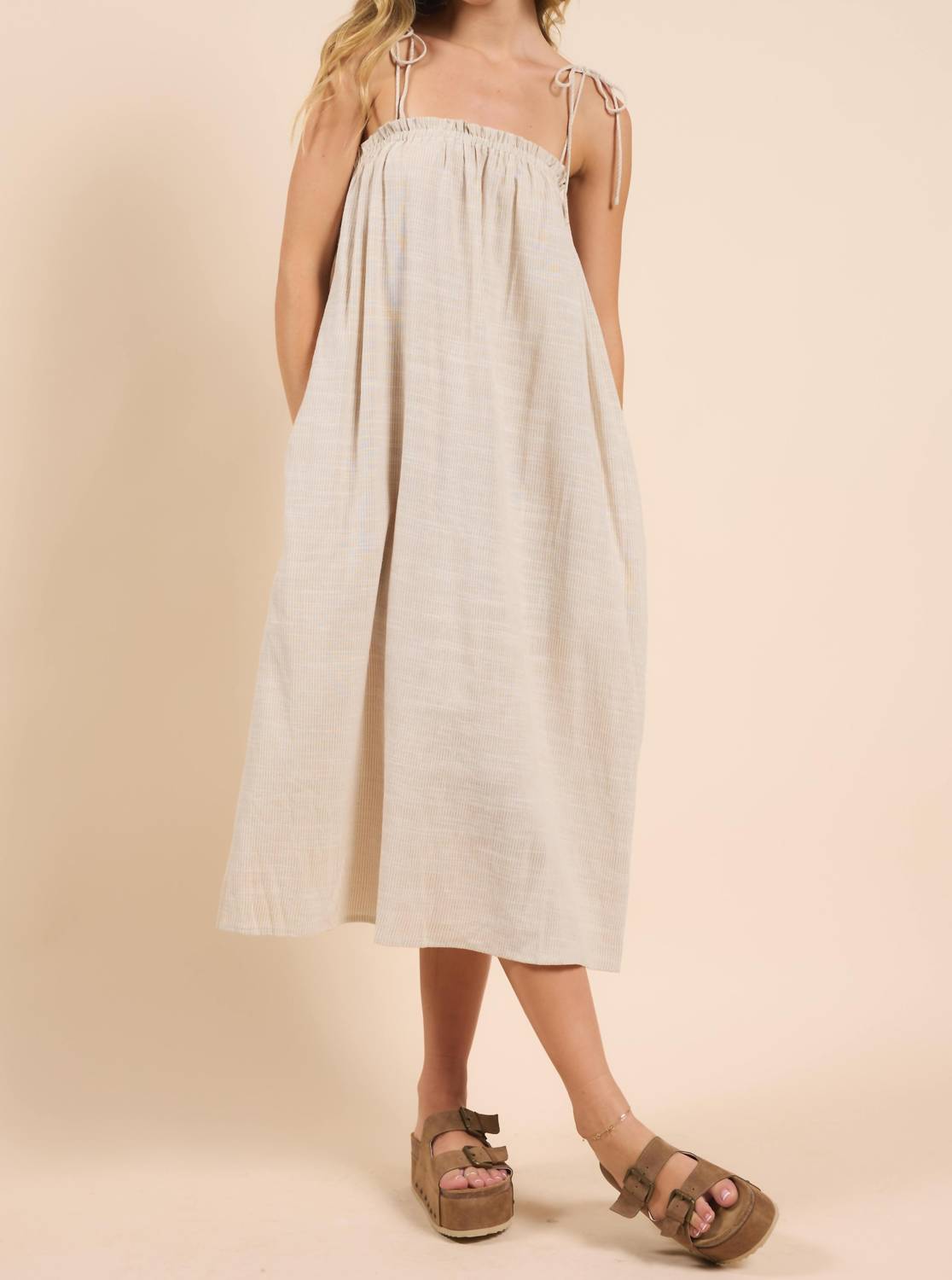 The perfect length dress does exist. Introducing the Mojave Tie Strap Midi Dress by Sadie & Sage, a perfect blend of style and comfort for those ultra-warm days. This boho chic taupe dress features spaghetti straps and a squareneck, emphasizing its flowy, shift silhouette ideal for holiday parties. Designed with practicality in mind, it comes with pockets and a tie closure for adjustable fit. Perfect for summer, this solid pattern dress embodies effortless elegance and comfort.