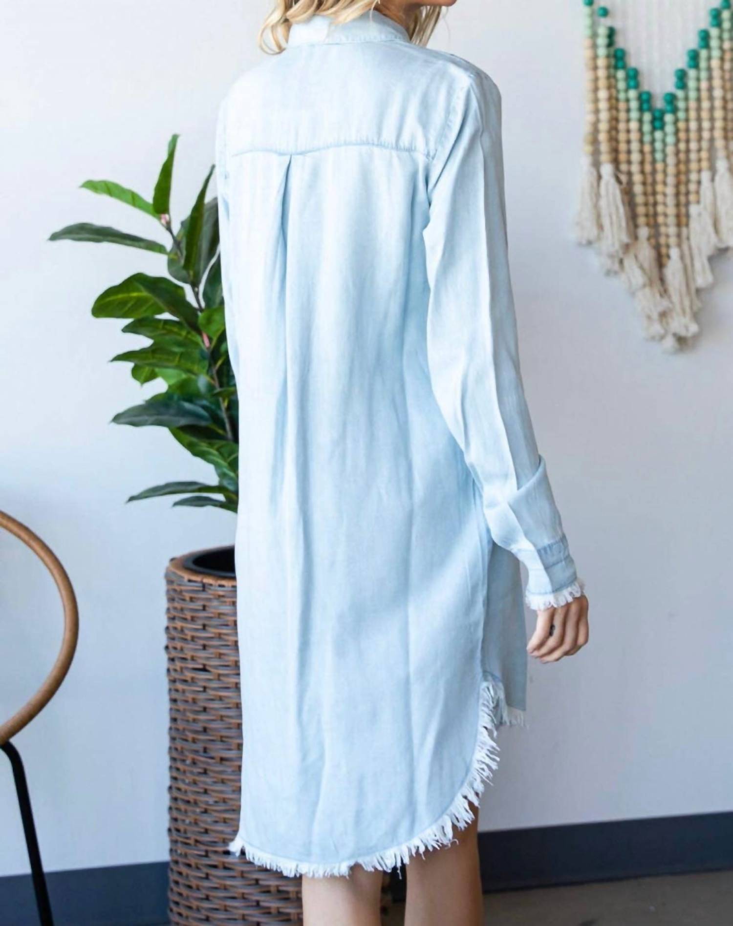 Collared neckline. Long sleeve. Button down closure. Chest pocket. Distressed hem. 100% Tencel. Hand wash.