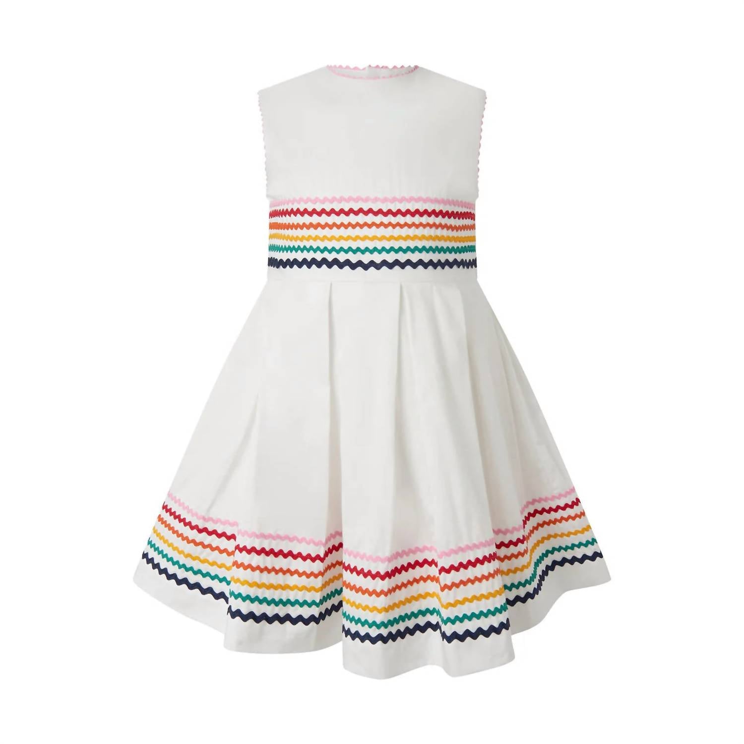 Brighten up any day with the Girl's Ric Rac Applique Dress from Rachel Riley, crafted with 100% soft cotton. This charming white dress features a playful ric rac pattern, making it perfect for twirling and birthday smiles. Designed for comfort, it includes a smooth liner for a gentle feel against the skin. Care instructions: Machine wash.