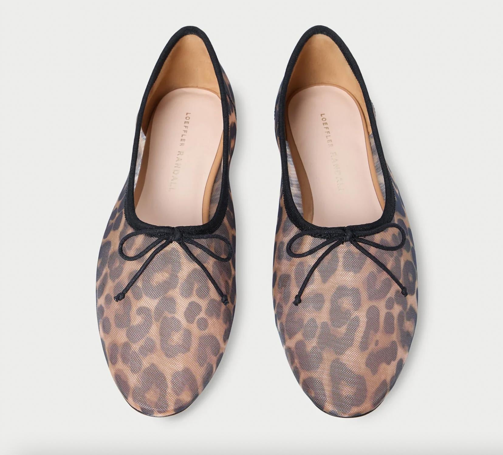 Loafers so versatile you can wear them with just about anything. Step into elegance with the Women's Landon Mesh Ballet Flat by Loeffler Randall, crafted in leopard mesh for a chic summer look. These flats feature a charming bow detail and an almond toe shape for a sophisticated profile. Enjoy comfort with their padded leather footbed, highlighted by a gold stamped logo. Slip them on for a touch of quiet luxury, perfect for vacation or Valentine's Day outings.