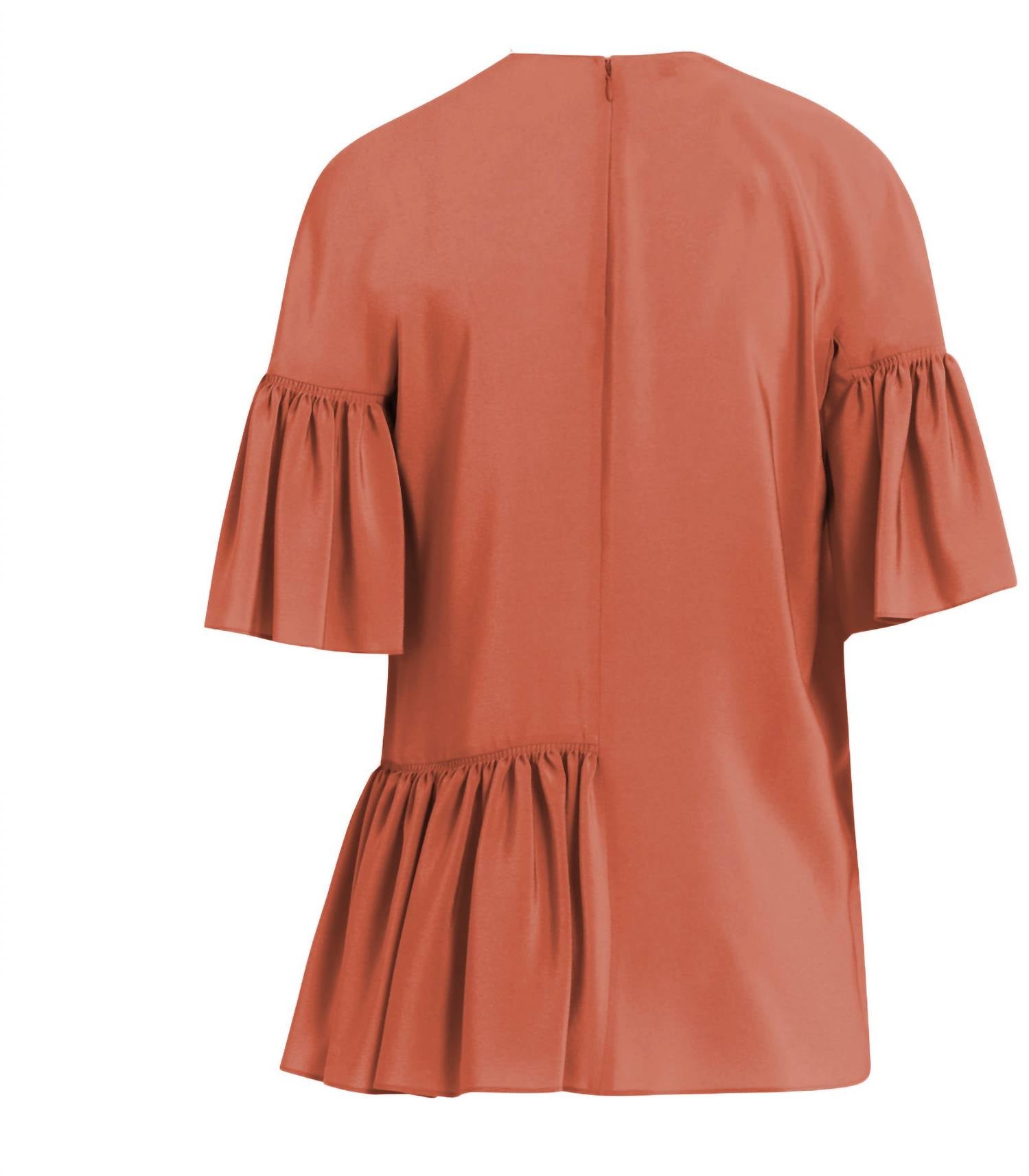 This peplum blouse features an asymmetrical ruffled design with short sleeves, adding a touch of elegance and movement. It has a back zip closure for a secure fit. Made from 100% silk, this blouse offers a luxurious feel and drape. Dry clean only.