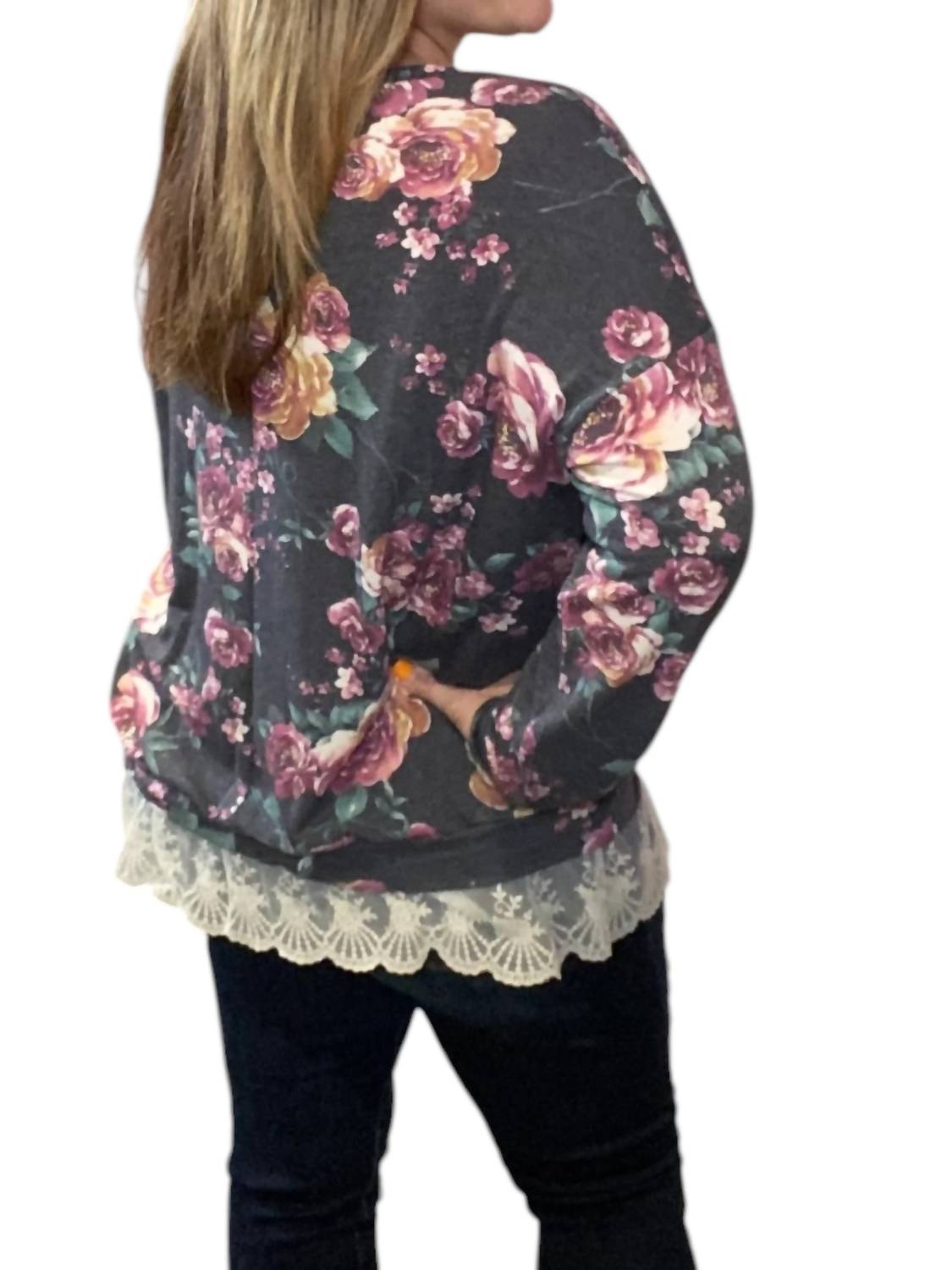 Crew neckline. Floral print. Long sleeves. Pull-over style. Lace hem. True to size. 63% Polyester 34% Rayon 3% Spandex.