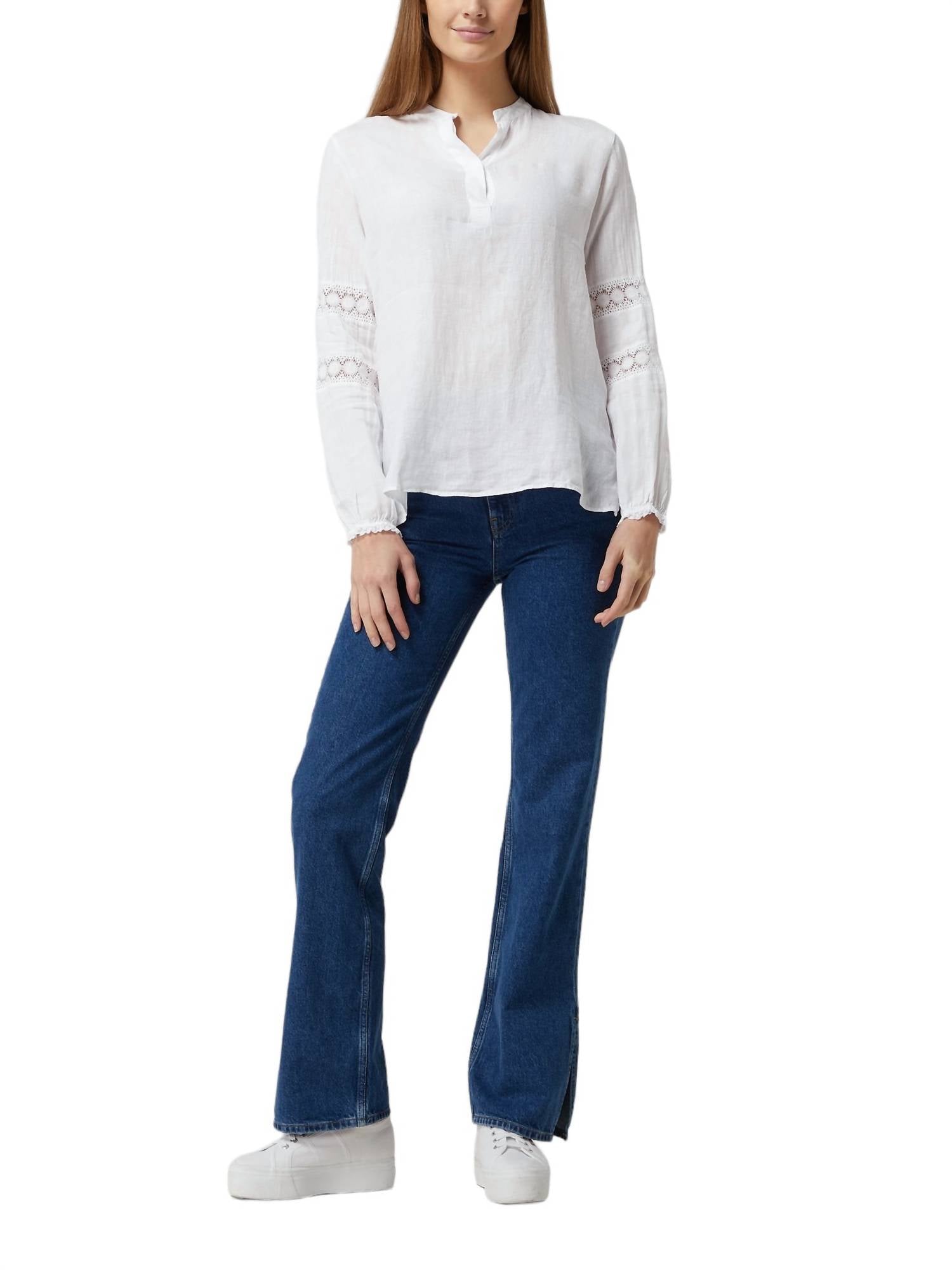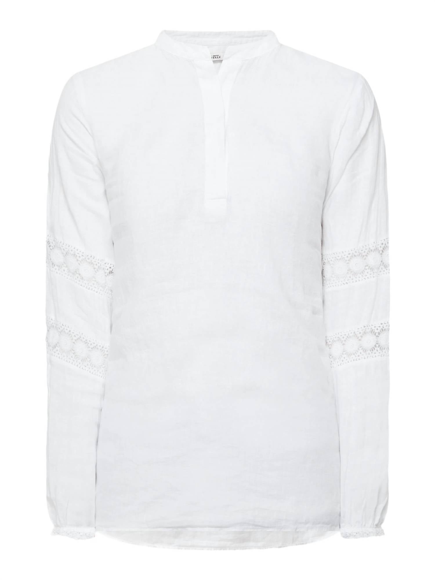 Features a stand-up collar and long sleeves with elastic cuffs adorned with lace trim. The rounded hem with a slit adds a stylish detail, while the button placket provides a classic closure. Made from 100% linen, it is best cared for with a gentle wash cycle at 40°C.
