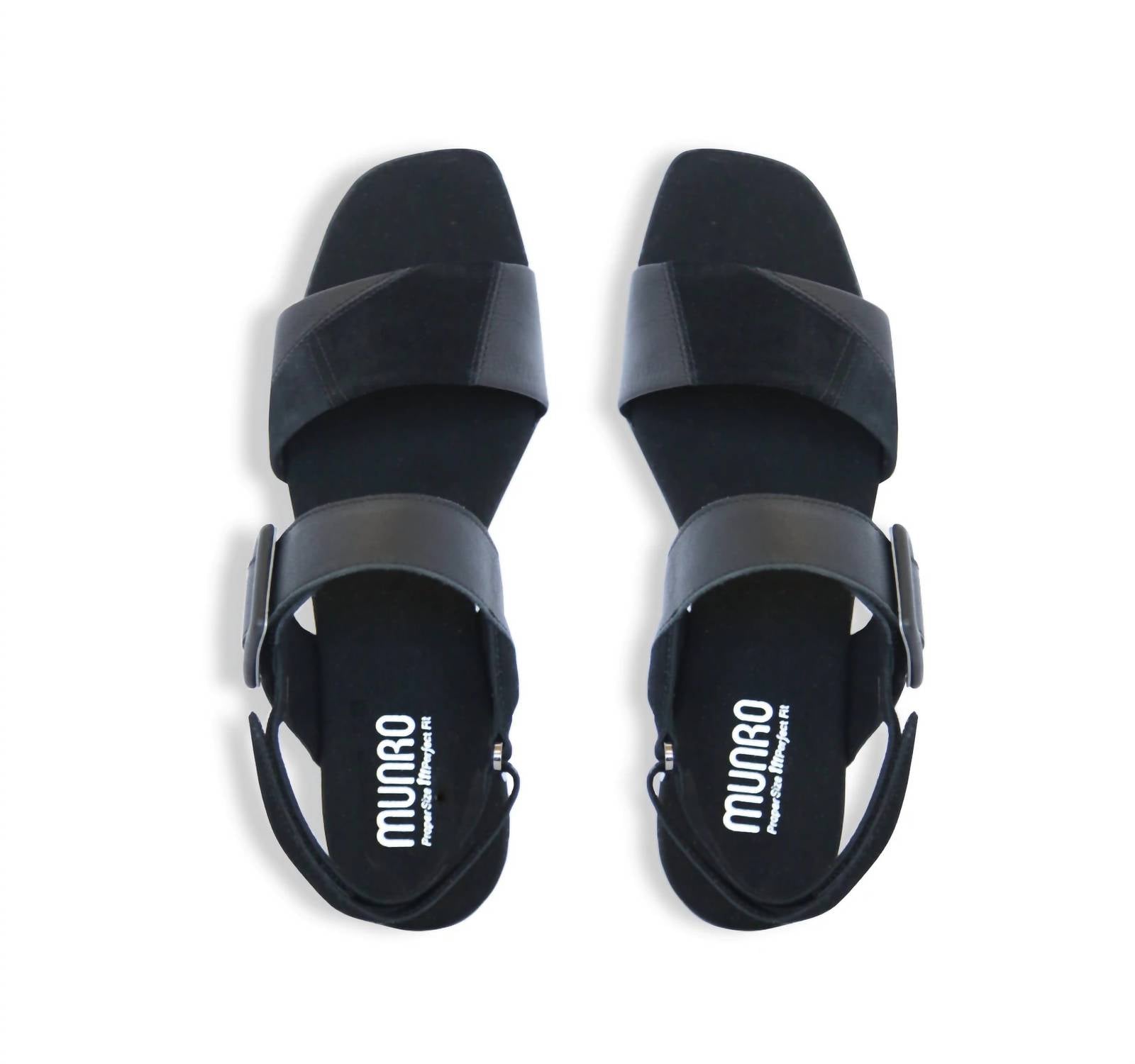 Flowy dresses, cropped pants, and even jumpsuits... this sandal works with them all! Step out in style with the Women's Frances Slingback Sandal by Munro, designed for a chic boardwalk stroll. Featuring a unique combo and color-blocked straps for a mod look, these sandals boast a retro rectangular buckle and a cool wood insert at the heel. Made with a leather upper and lining, and supported by a sturdy rubber sole, they offer durability and comfort. Assembled in the USA from imported materials, they showcase an open toe and 1.5-inch block heel for a sophisticated, low-profile lift.