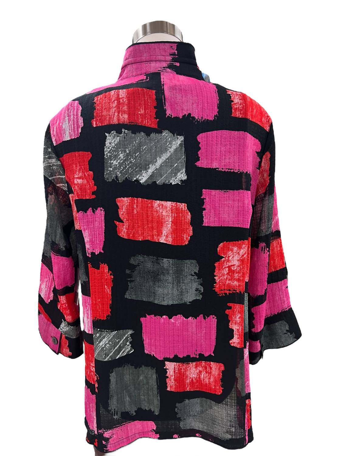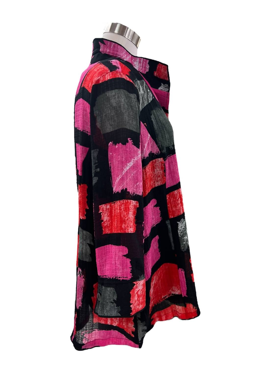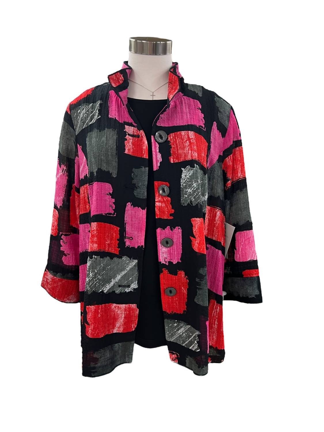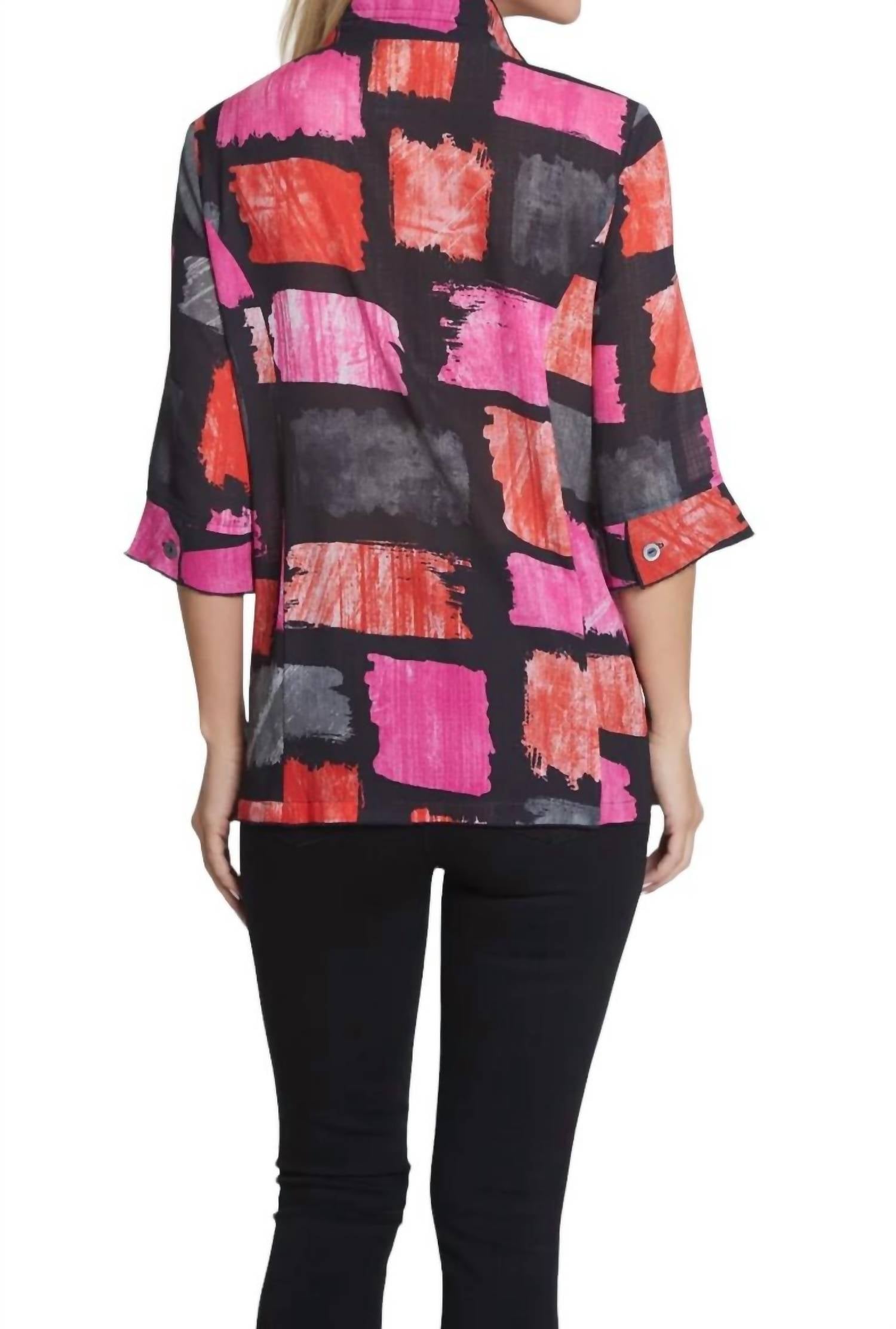 A jacket so versatile you can literally wear it with anything. Elevate your wardrobe with the Multiples 3/4 Sleeve Button Front Print Jacket, showcasing a stylish Fuchsia/Black box print. Crafted with three-quarter sleeves and a chic woven texture, this polyester/spandex blend jacket provides both comfort and flair. Designed for women, it features a wire collar and convenient button closure. Care: Machine wash for effortless maintenance.