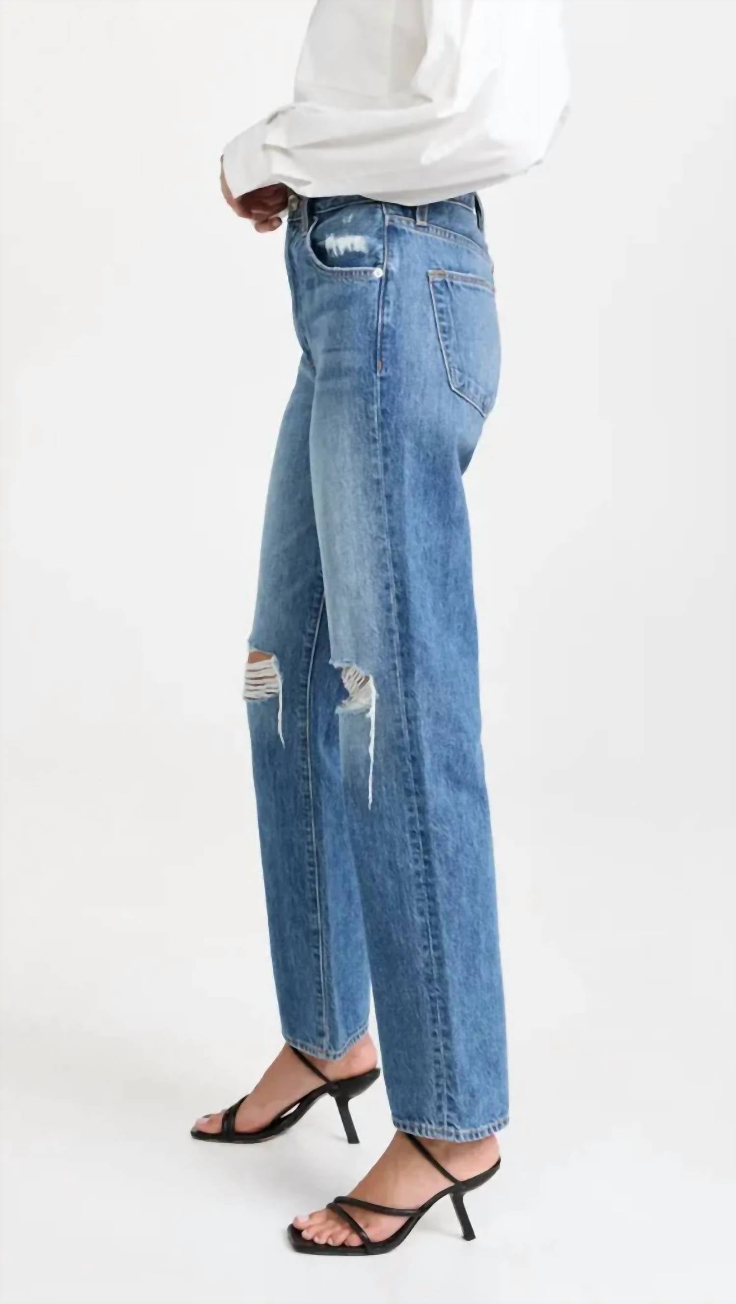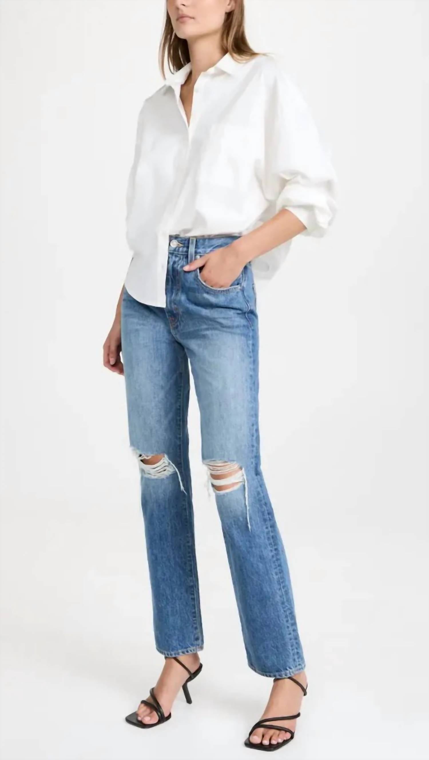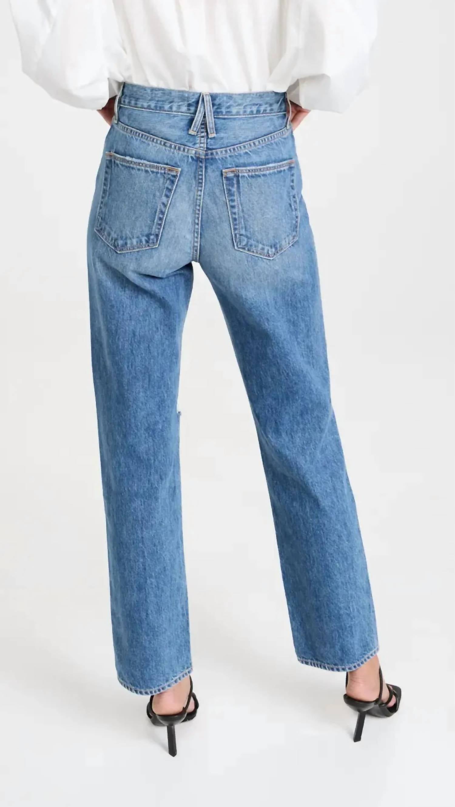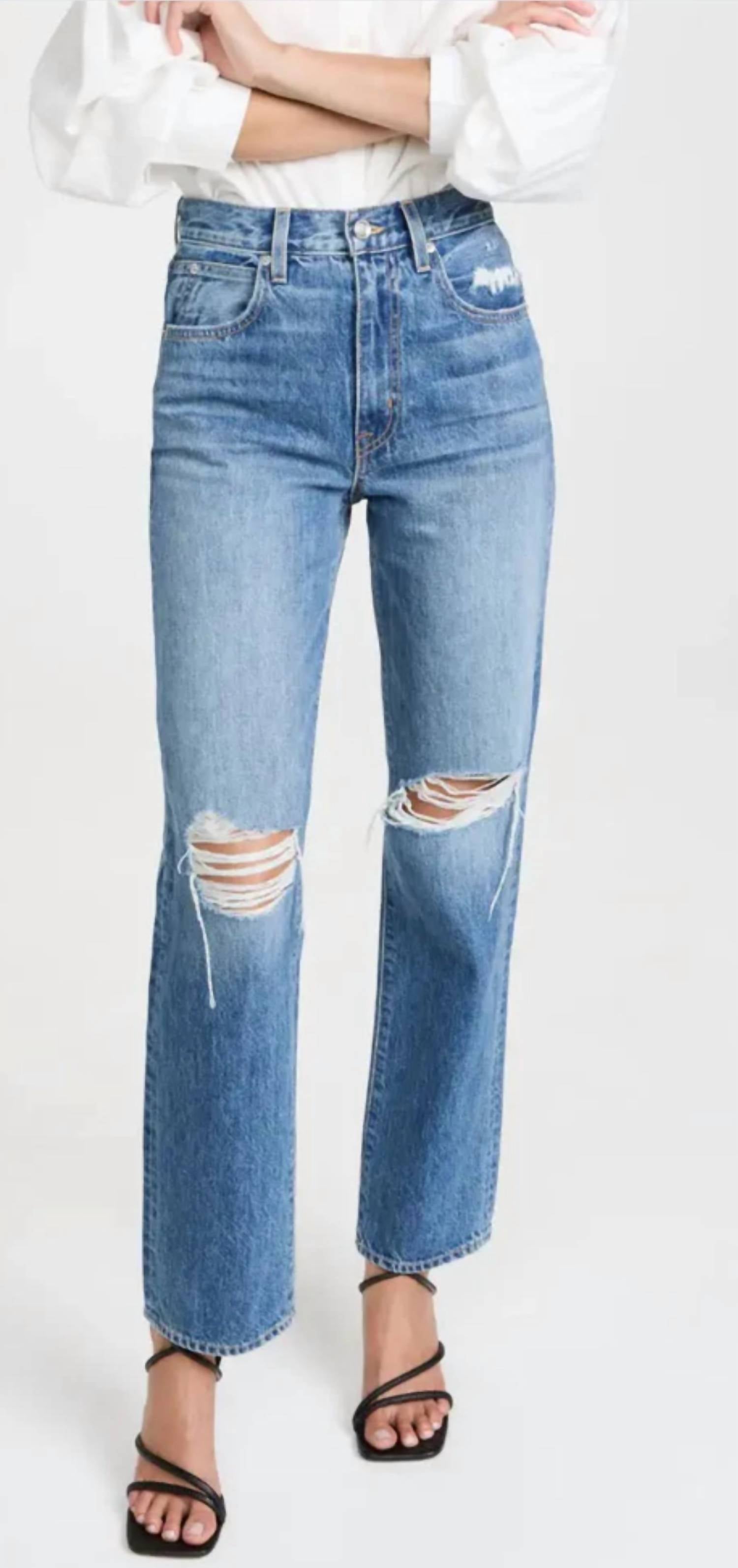 This classic straight leg jean has a perfect fit and goes with just about everything. Introducing the SLVRLAKE London Straight Jean in Gimme Shelter, a stylish choice for effortless elegance. These full-length, mid-weight jeans are crafted from 100% cotton with a relaxed, straight-leg fit and feature a classic button closure with a zip fly. The design includes a faded wash with a distressed aesthetic and practical 5-pocket styling. Originating from the USA with imported materials, these jeans are machine washable for convenient care. Model is 5'11" and wears a size 26.