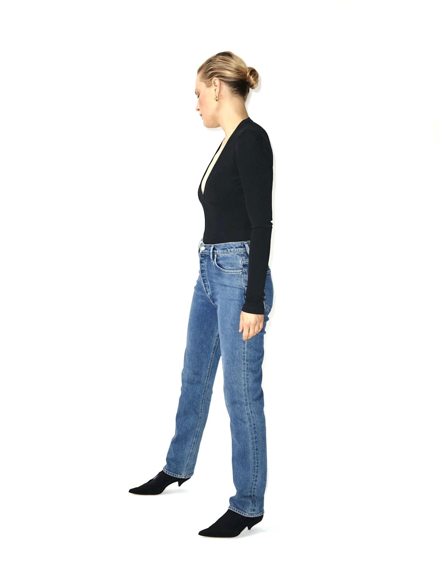Slim Straight. High Rise Jeans. Zip fly. Button Closure