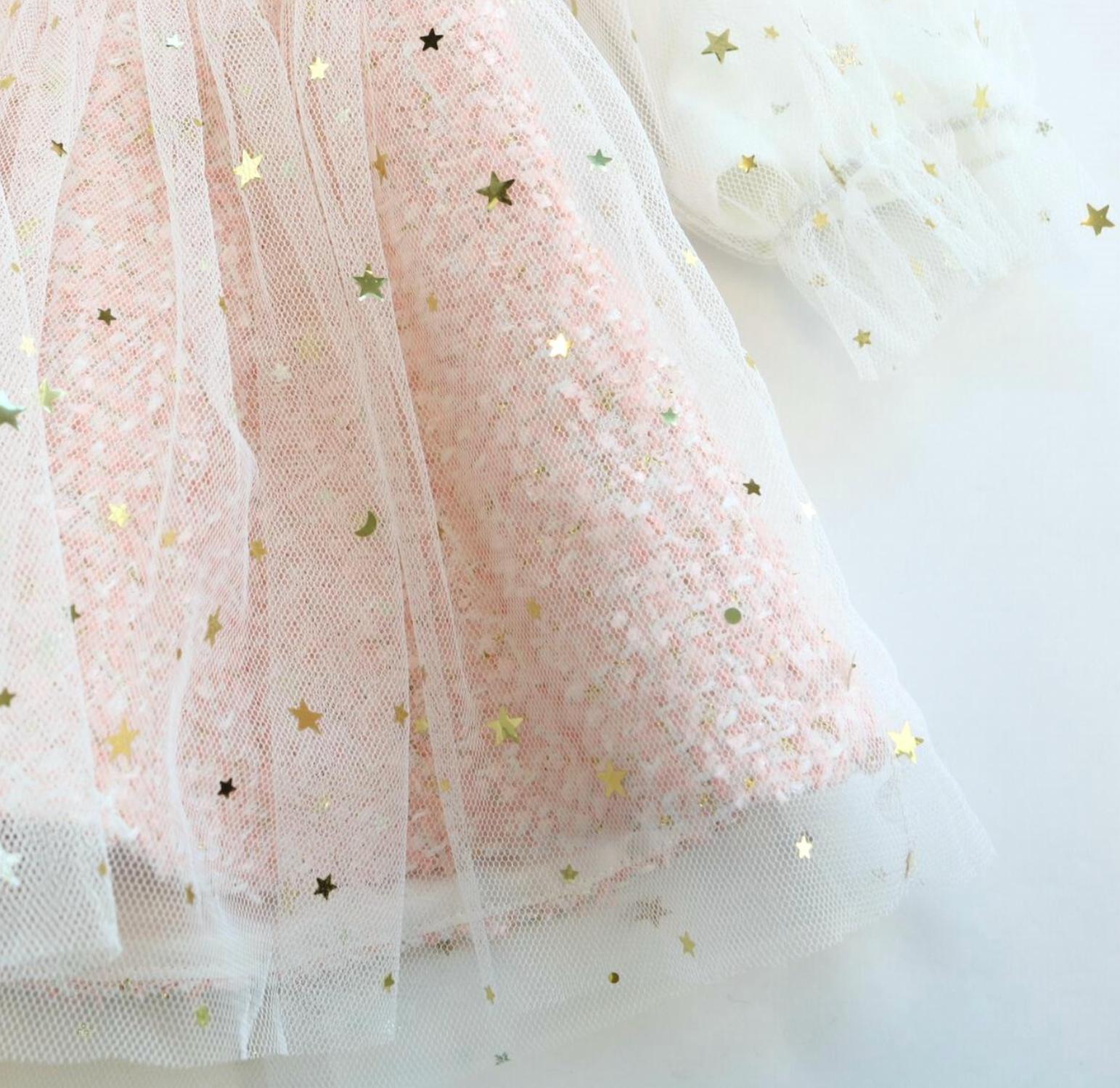 Mesh tulle with metallic stars and moons on sleeves and skirt