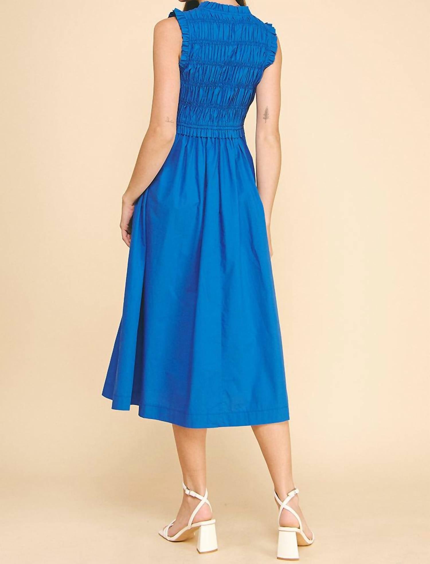 The perfect length dress does exist. Presenting the Valeria Ruched Bow Dress by PINCH, a perfect blend of style and comfort in Oxford Blue. This sleeveless A-line dress features a ruched bodice and two bows, providing a chic touch to your summer wardrobe. Crafted from 100% Cotton, it measures 48" in length for size small and extends with a tie closure for easy wearing. Designed with pockets for added convenience, it requires hand washing to maintain its pristine condition.