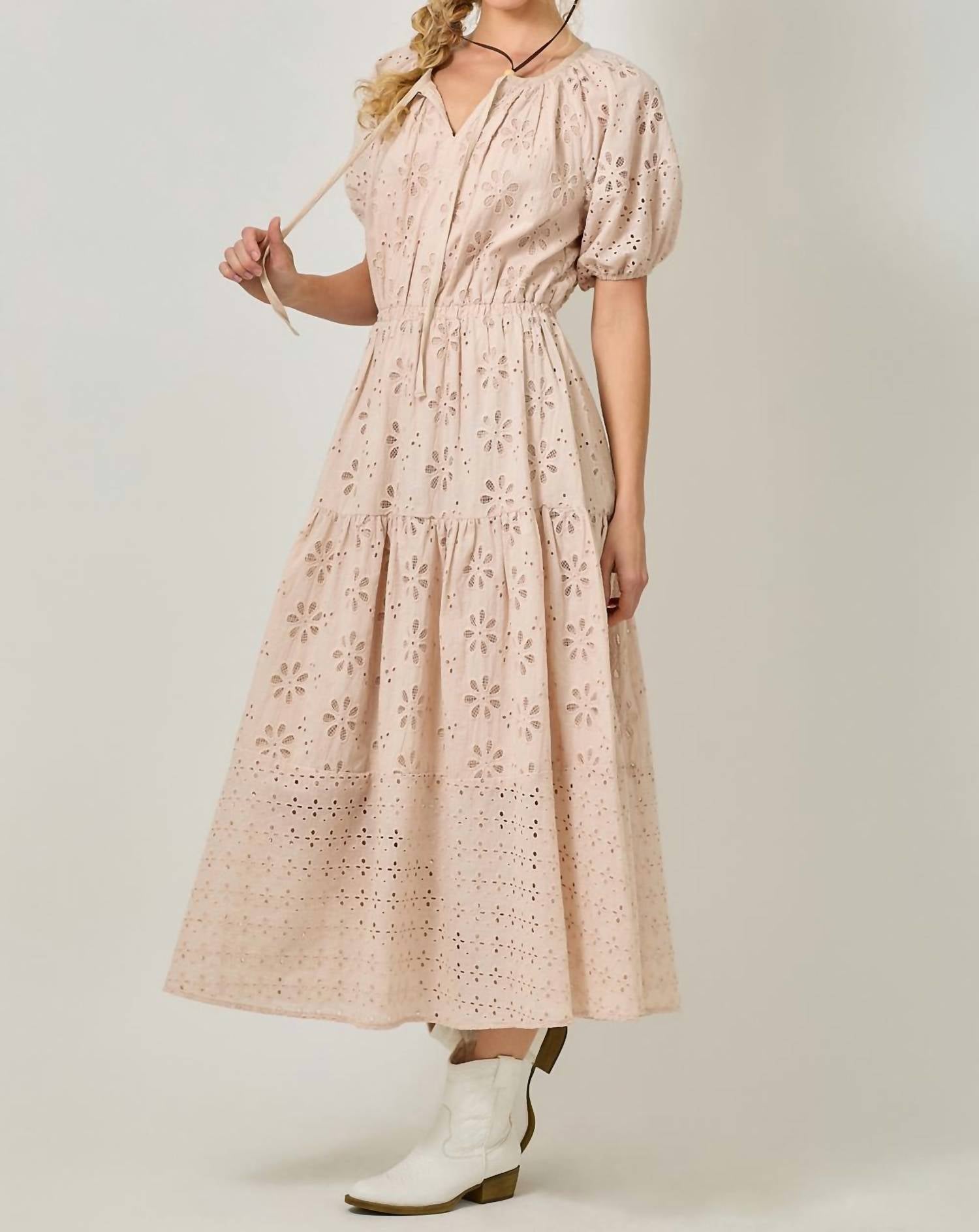 A midi dress so versatile, your options for wearing it are endless. Introducing the Puff Sleeve Tiered Eyelet Dress by Mystree, a chic A-line midi dress in French Vanilla. Featuring delicate eyelet details and flattering short puff sleeves, the dress is crafted from 100% cotton for a textured and breathable finish. Perfect for vacation or Thanksgiving gatherings, it offers a relaxed pull-on closure and a stylish V-neckline to enhance any boho chic look. Pair it with your favorite accessories to effortlessly capture the essence of summer.