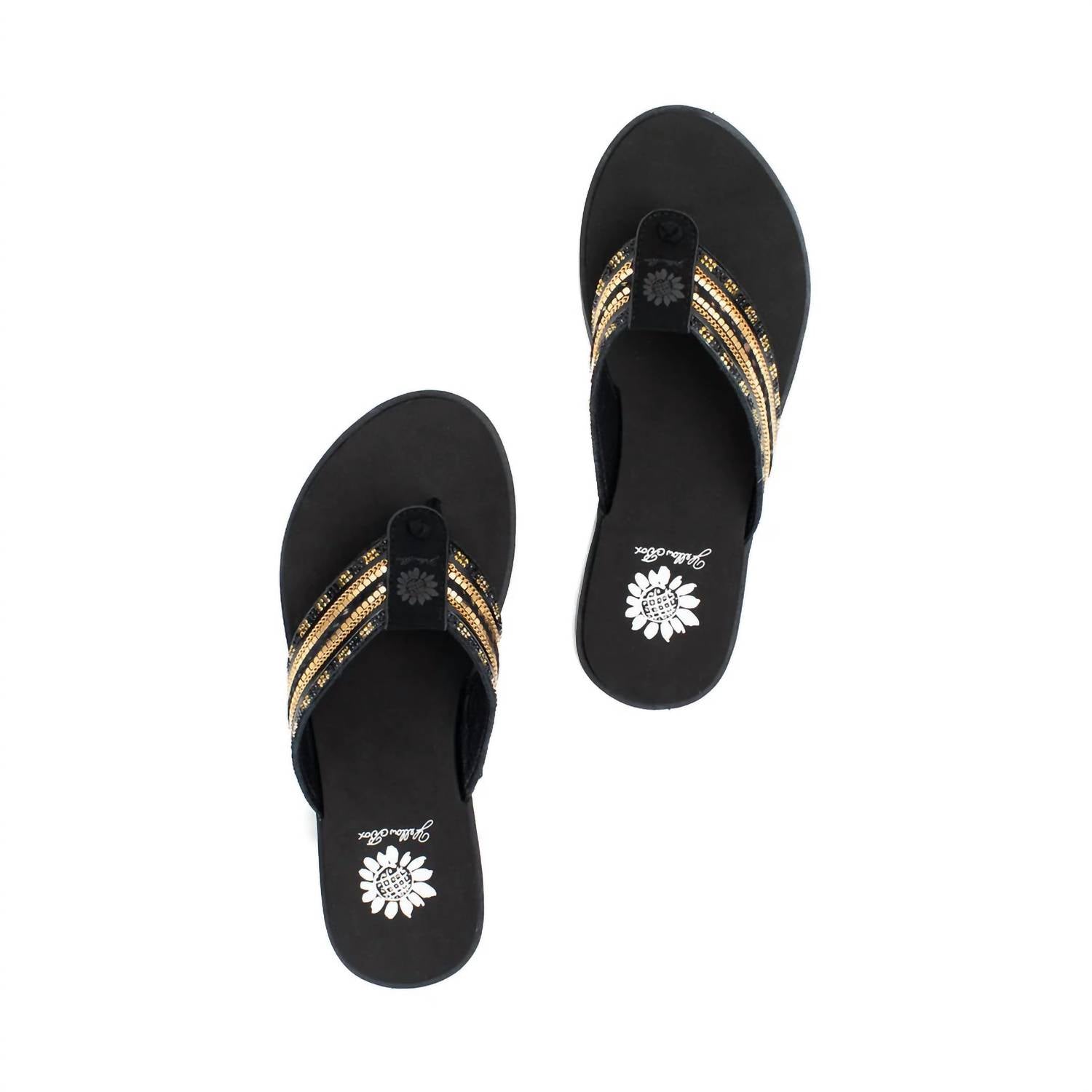 These flip-flop sandals feature diverse materials, metallic highlights, and rhinestone details. They have a slender silhouette, a round toe, and a Yellow Box EVA footbed. The heel height is 0.75 inches, with a 0.5-inch platform. Made from leather, with a signature Yellow Box EVA insole and a rubber outsole.