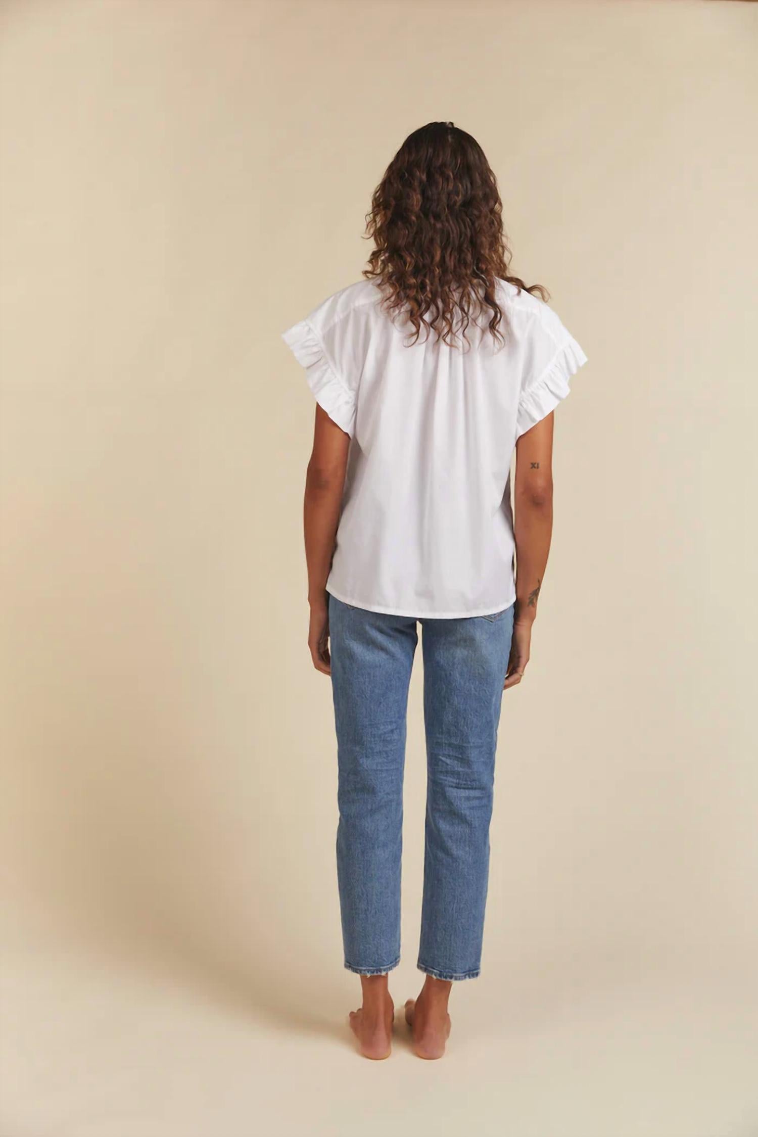 Look no further, you just found your perfect tee! 100% cotton. With its vintage-inspired style featuring slightly cropped body, short side slits and antique white buttons, this shirt has a flirty punch with its edgy ruffle sleeves. Perfect for kicking your look up a notch! True to size. Slightly cropped body. Model is 5'7" and wearing a size S. Machine wash cold, separately. Tumble dry low, medium iron as needed. Handmade in California
