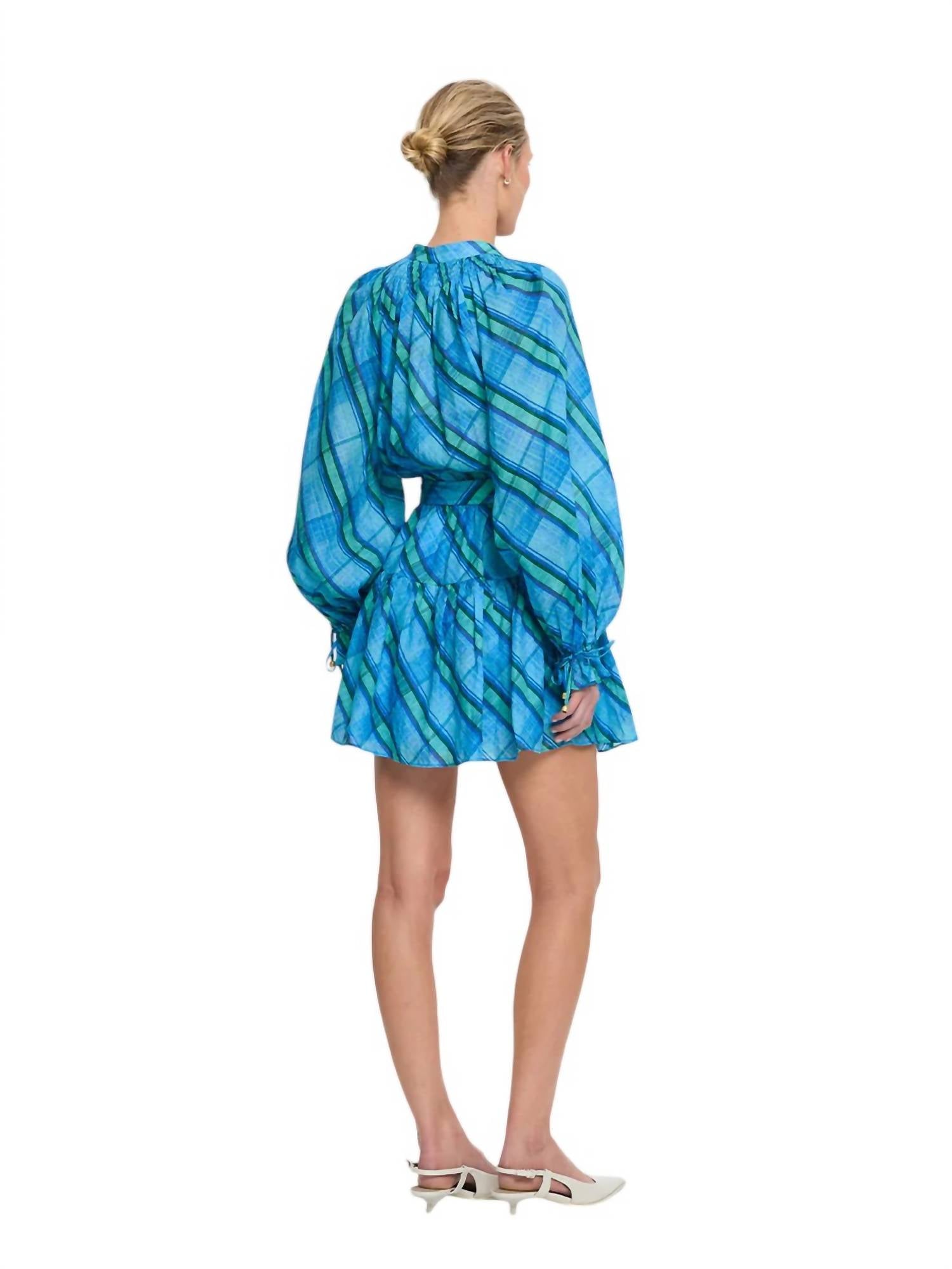 This mini dress features a stand collar, shirring detail at the neck, and a button-through front. It has raglan sleeves with elastic cuffs and frills, an elasticated waist, and a removable D-ring belt. Made from 100% ramie, it fits true to size.