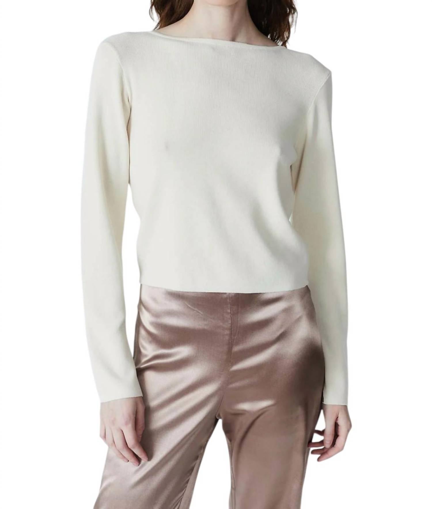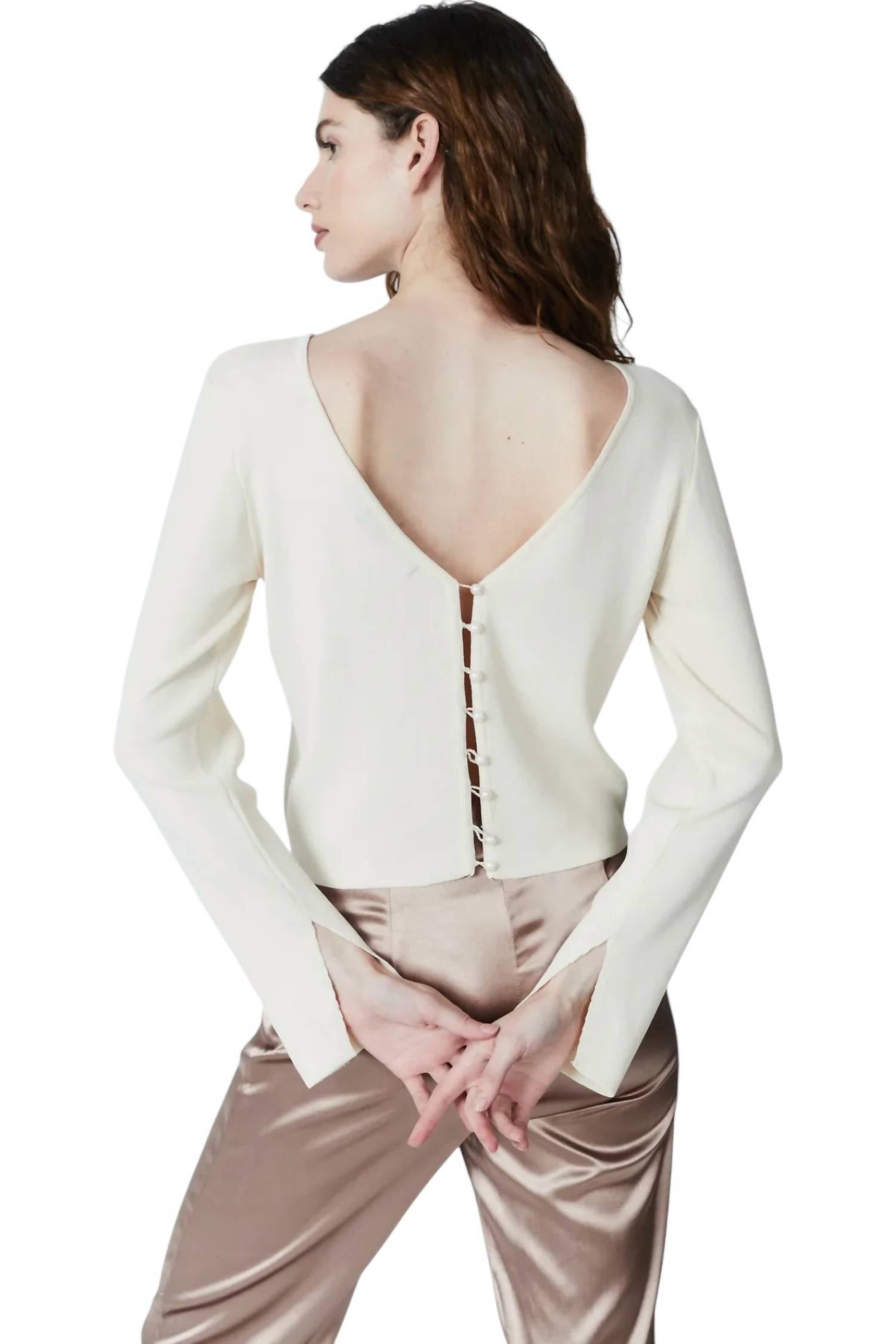 Sophisticated long-sleeve pullover in a versatile ecru shade. Features a unique button-up detail on the back. Crafted from a blend of 65% viscose and 35% polyamide. Ensures a comfortable and lightweight feel. Completed with a stylish boatneck.