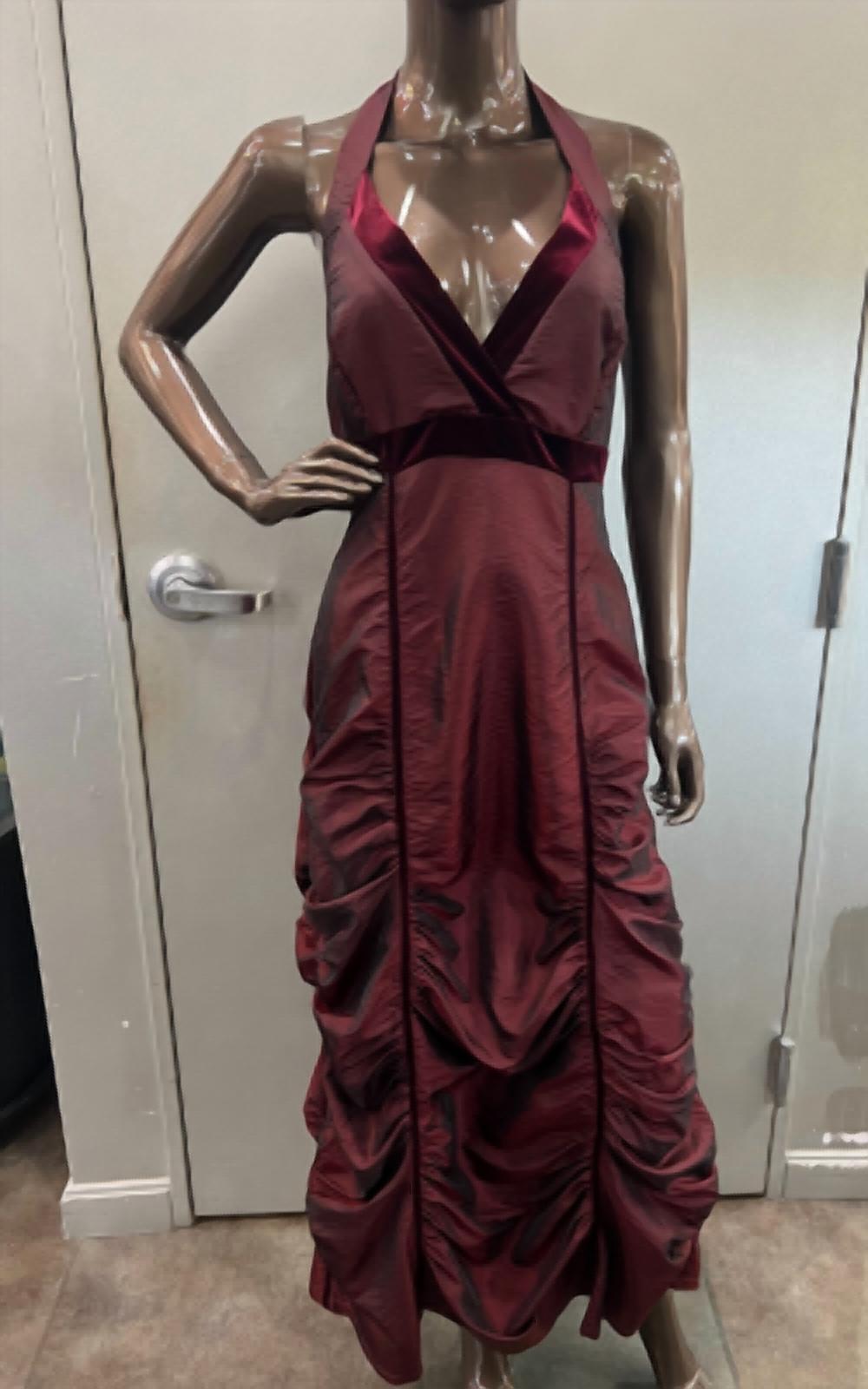 A maxi dress that is just as cute as it is comfortable. Ronen Chen juliet red halter dress with velvet v-neckline and rouching throughout. Zipper back. Runs small. Dry clean only.
