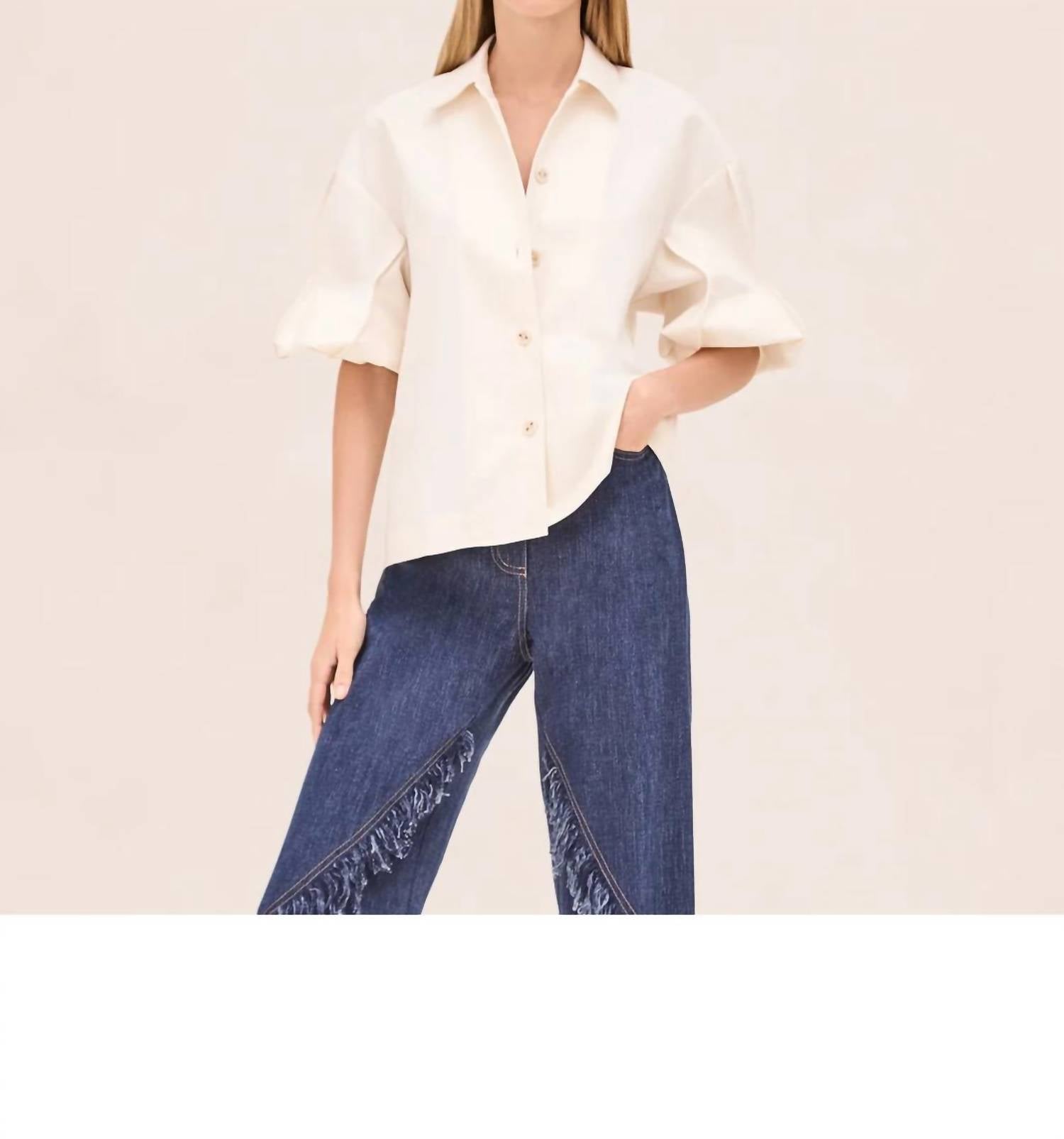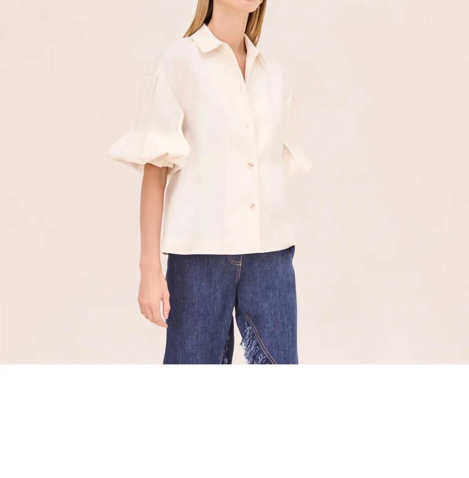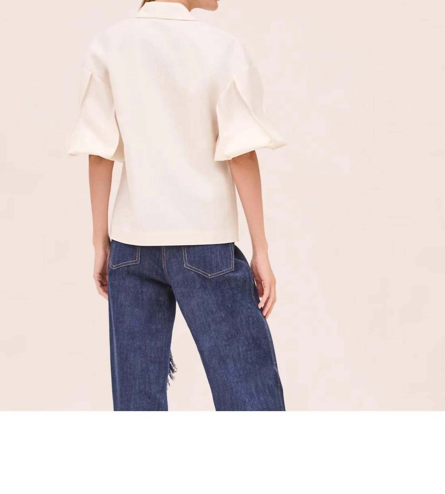 Perfectly tailored and soft to the touch. Introducing the Elise Top by ALEXIS, a sophisticated button-down available in a soft ivory. This elegant shirt highlights sculptural short sleeves and a classic collared neckline, making it perfect for summer occasions like a baby shower. Closure: Button closure. Care: Machine wash.