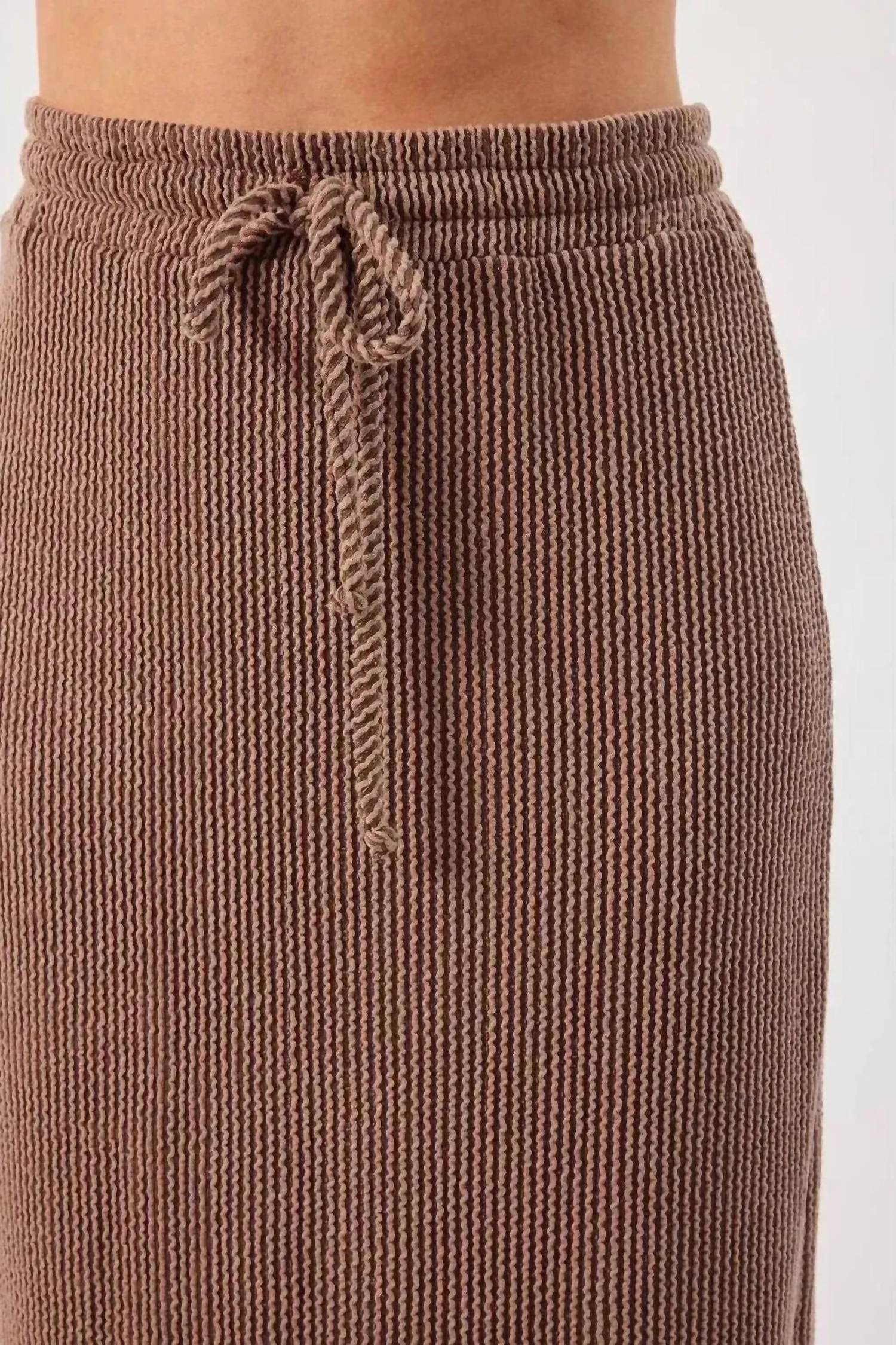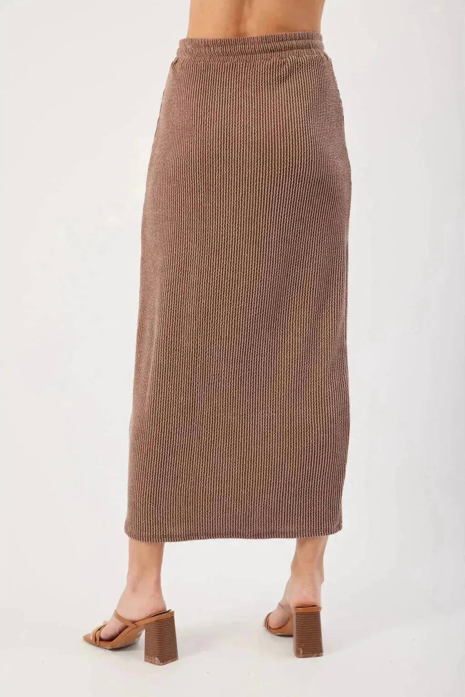 Show off just the right amount of skin in this beautifuly designed midi length skirt. Introducing the Kaya Tie Waist Midi Skirt by Kylie Paige, a fashionable choice for any occasion where elegance is key. With its midi length of 34.5 inches, this skirt features an elasticated waist with a functioning drawstring, offering comfort and fit flexibility. Crafted from a unique blend of 76% Polyester, 21% Rayon, and 3% Spandex, it features a textured pattern in chic brown for a modern flair. While it's perfect for a dinner party or as spring workwear, its versatile style allows pairing with numerous tops for endless outfit possibilities. Model is wearing a size S with a height of 5'9".