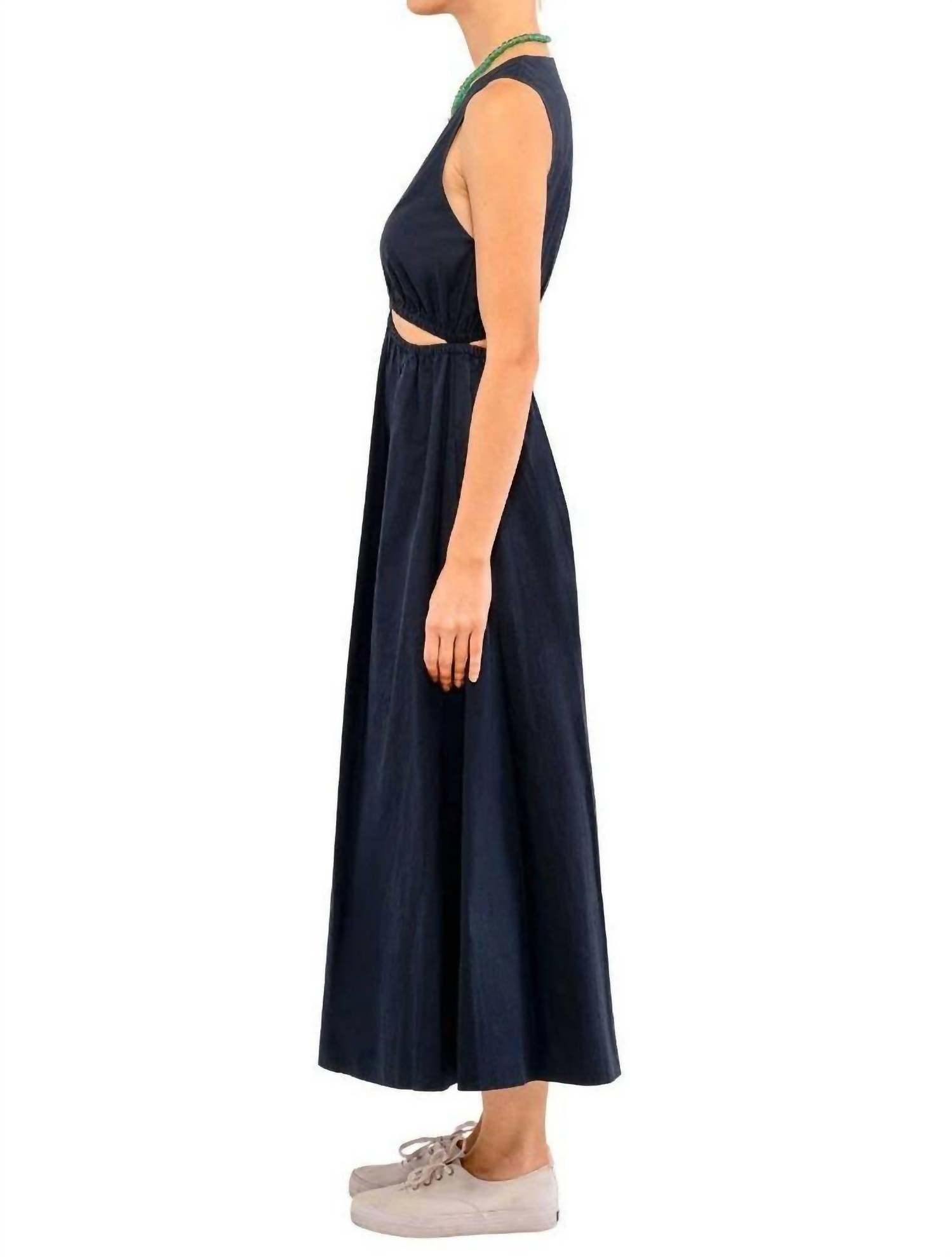 Who doesn't love a good maxi dress? This one you'll be reaching for season after season. Introducing the Hello Dress by Gretchen Scott, a navy sensation designed for effortless elegance. This sleeveless maxi dress features a flattering 52" length, V-neckline, and chic cutouts below the bodice and lower back for a modern twist. Composition: 100% Cotton Poplin. Closure: Pull-on style with an elastic waistband for cutout adjustments, complemented by practical side seam pockets. Care: Machine wash cold, tumble dry cool, or dry clean for best results.