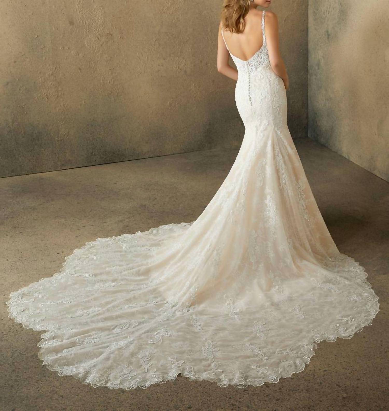 Rock your big day with this effortlessly chic wedding dress, designed with impeccable detail and fit to perfection. Say 'yes' to the dress and make it a day to remember. The Rashida Crystal Beaded Dress by MORILEE is a stunning sleeveless wedding gown in elegant ivory. This designer dress features exquisite crystal beaded, embroidered appliqués layered over a delicate tulle and Chantilly lace, culminating in a fit and flare silhouette that is both graceful and modern. The V-neckline enhances its feminine charm, while the back button closure adds a classic touch. Ideal for weddings, this gown showcases a petal train and scalloped hemline that assure a breathtaking entrance.