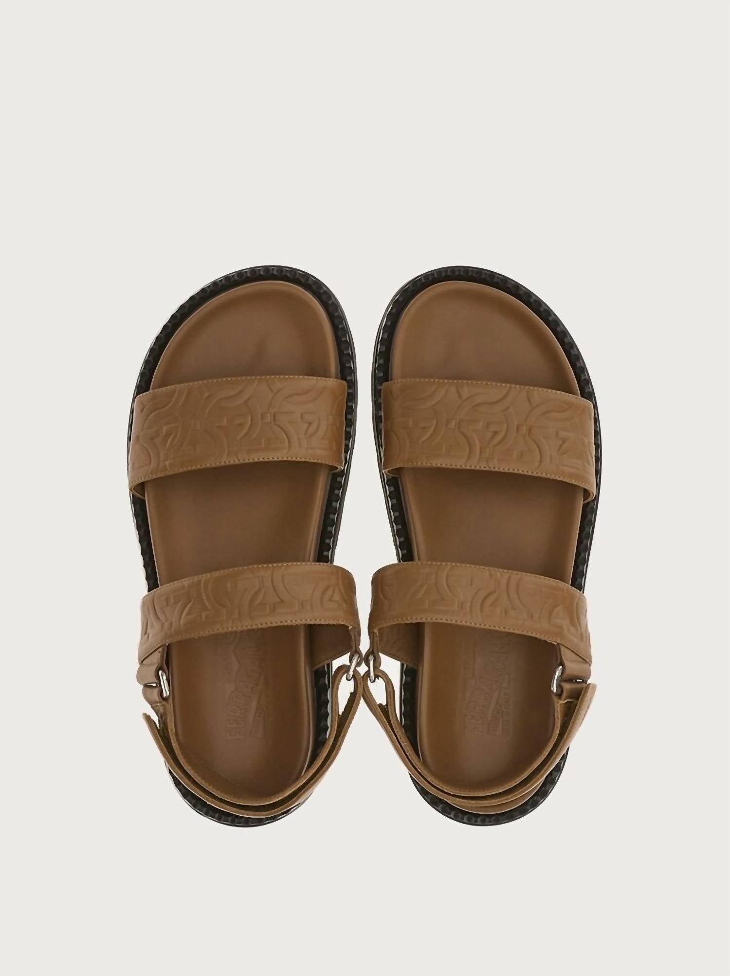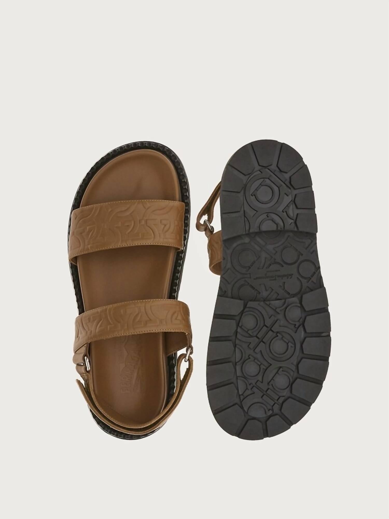 Step into style with the Men's Gancini Sandals by Salvatore Ferragamo, perfect for a fashionable summer look. These brown sandals are crafted from soft, rich Italian calf leather, featuring a striking three-dimensional Gancini pattern. Designed with a minimalistic double Velcro strap over a chunky rolled welt and sturdy rubber sole, they offer an edgy appeal. Made in Italy, they include an ergonomic inner sole for all-day comfort.