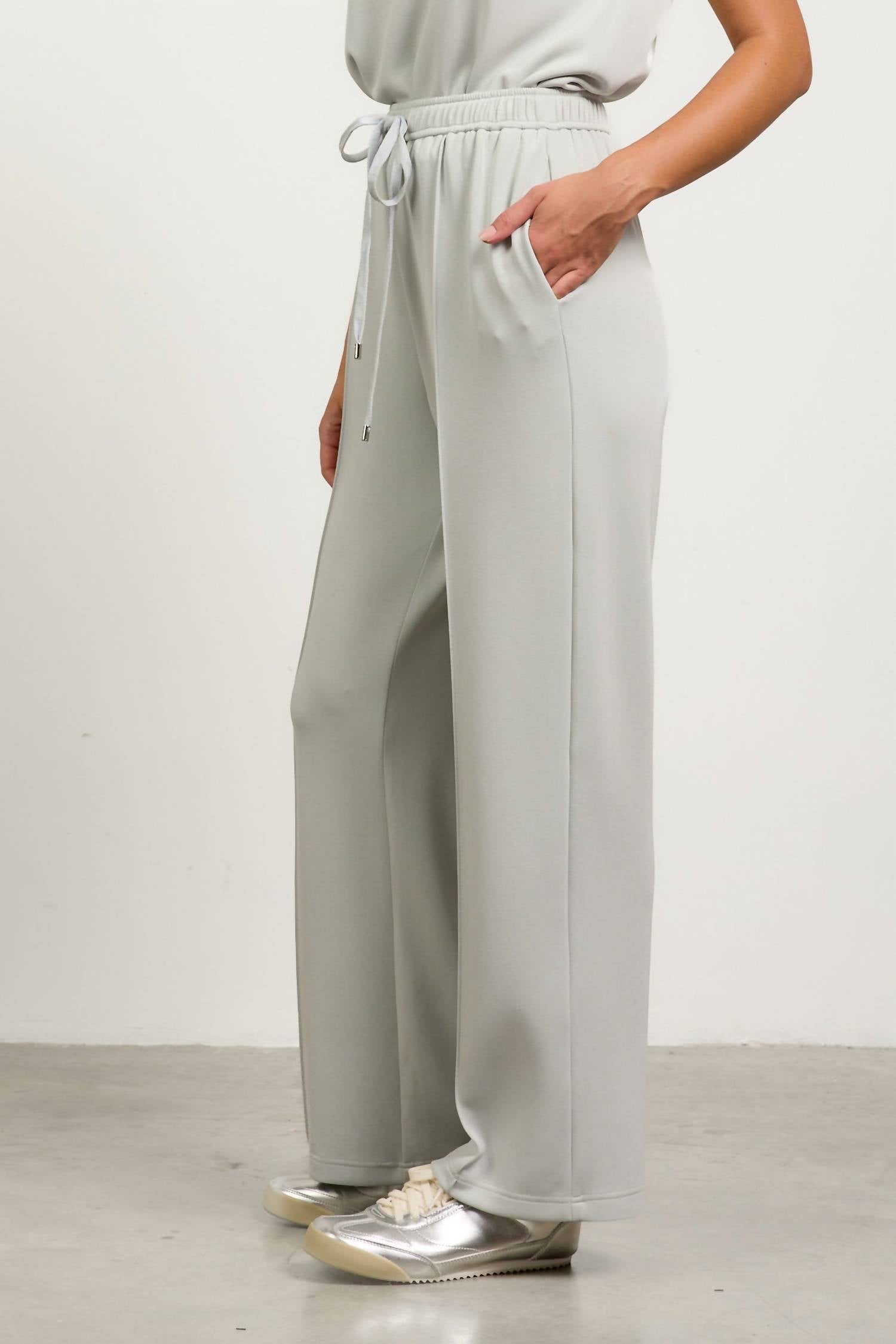 A straightleg pant that workes season after season. Dress these up with your favorite blouse or keep it casual with your go-to tee. Enhance your athleisure wardrobe with the Payton Scuba Pants by SKIES ARE BLUE, offered in a stylish Powder Blue Grey. These mid-rise straight-leg pants feature an elastic waist with a drawstring for a comfortable and adjustable fit. Crafted from a soft scuba fabric blend of 48% Polyester, 46% Modal, and 6% Spandex, they are ideal for both fitness activities and casual outings. Care instructions include hand washing to maintain their quality and shape.