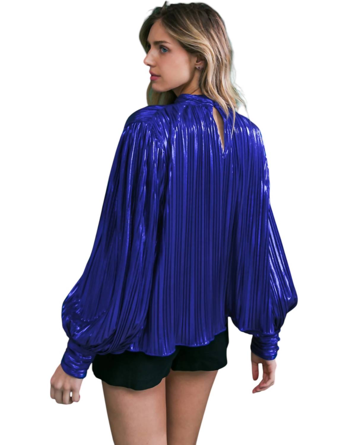 Features a high neckline, long sleeves, and a fully pleated design, offering a stylish and comfortable fit. 95% polyester, 5% spandex. Hand wash cold.