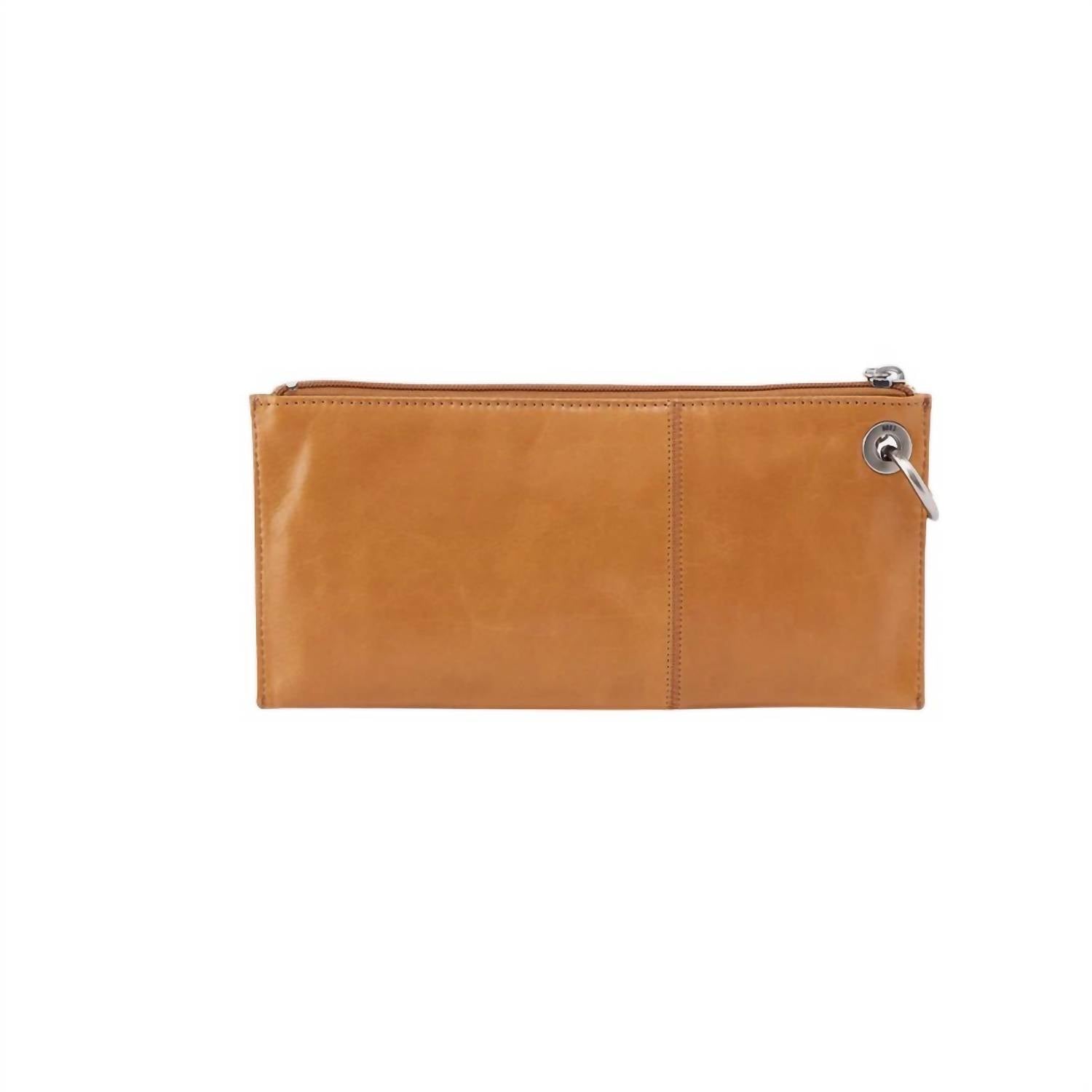 This leather clutch features a convenient wristlet strap, a zipper closure, and is designed to fit your phone. It has brushed nickel hardware, a sandlewood lining, and measures 10" W x 5" H x 0.5" D.