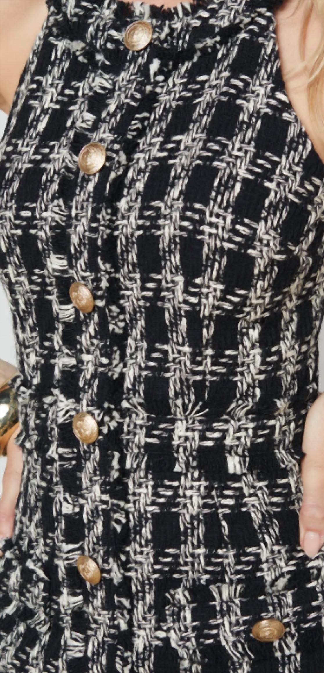 Fits true to size, order your normal size. Fitted at the bust, waist, and hips. Designed to hit above the knees. Round neck with fringed trim. Sleeveless, cut-in shoulders. Front faux button placket. Back concealed zip closure. Fringed waistband. Two faux side patch pockets. Fringed hem. 72% viscose, 28% polyester. Hand wash or dry clean.