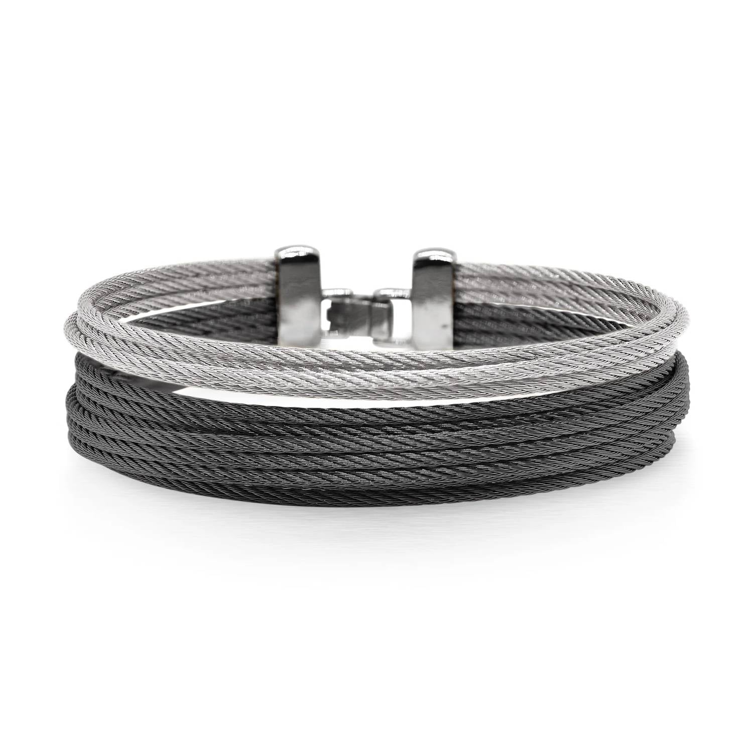 Stacked or solo - you can't go wrong with this bracelet. Sophisticated piece for the modern man. Showcases a sleek design crafted from stainless steel cables in a striking black and grey color combination. Made with a focus on enduring style.