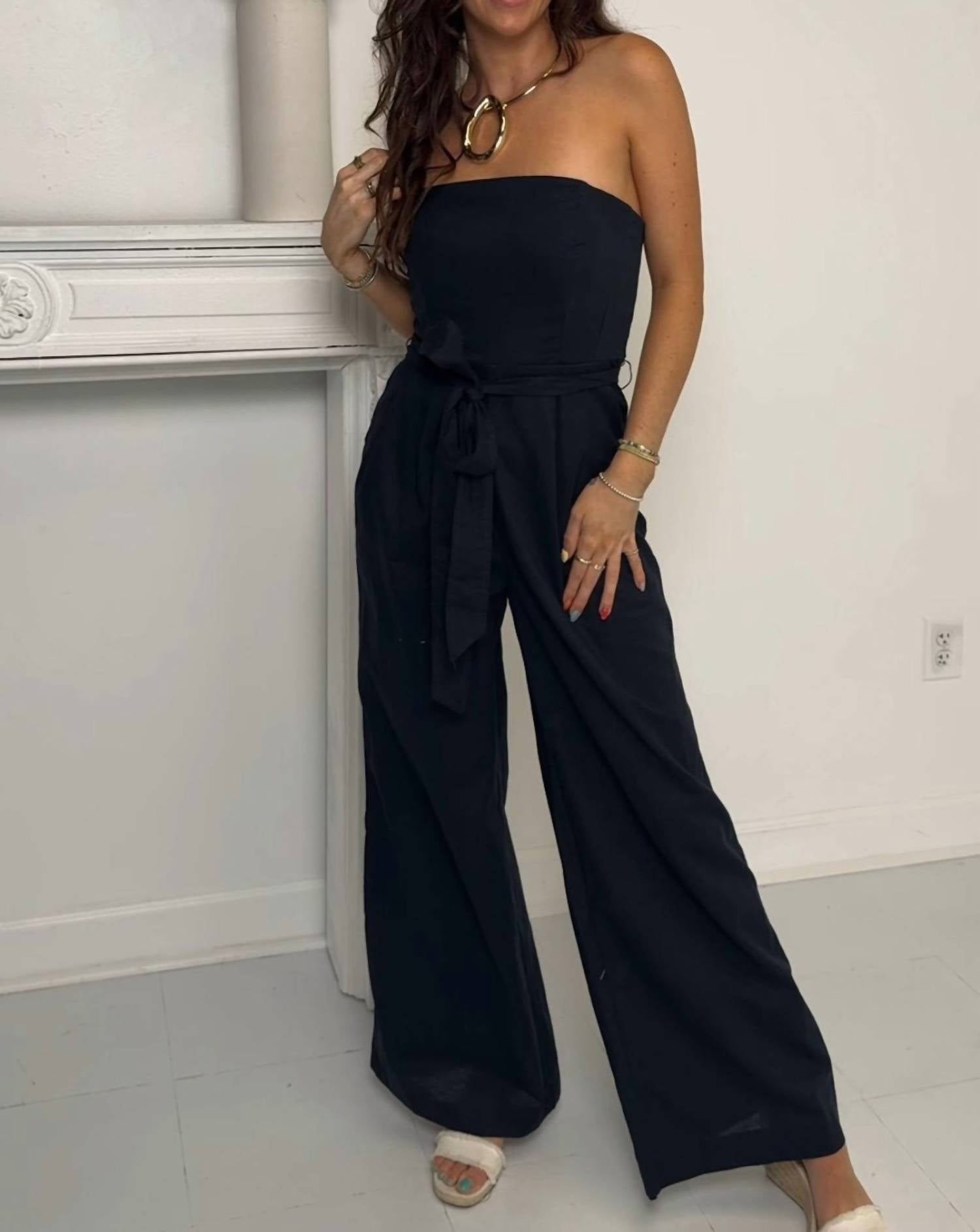A set so cute you'll never want to take it off. Designed to look good while lounging, this little number is the perfect outfit for hanging at home in style. Introducing the Strapless Wide Leg Jumpsuit by DRESS FORUM in an elegant Midnight hue, perfect for any evening affair. This solid, strapless piece features a high-rise elastic waistband, soft boning, and a chic sash belt for enhanced shaping. Designed with functionality in mind, it comes with side pockets and boasts a relaxed fit with a 30-inch inseam for comfortable movement. Composition: 70% Cotton, 30% Linen. Care: Machine wash.