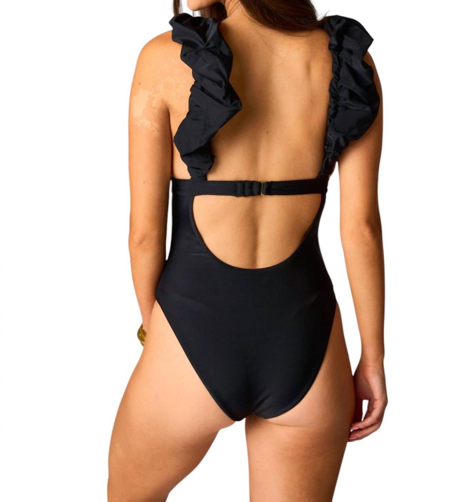 Enjoy summer with the Lala Ruffle Shoulder One Piece by BuddyLove, part of the Morgan Willett xx BuddyLove Swim Collection. This black swimsuit features a deep v-neck and scrunched elastic straps for a flattering fit with medium cheek coverage. Made from 82% nylon and 18% spandex, it offers comfortable stretch for various body types. Measurements are 33" waist for small, 35.5" for medium, and 38" for large, with lengths of 29", 30", and 31".