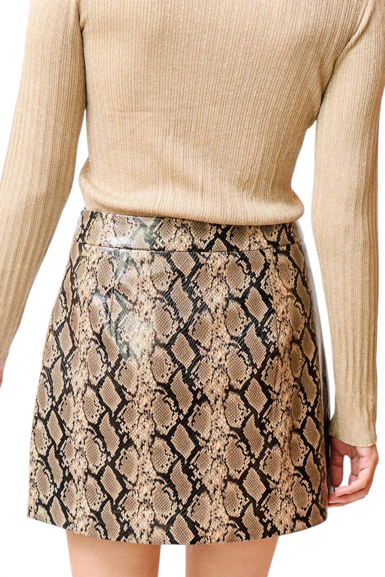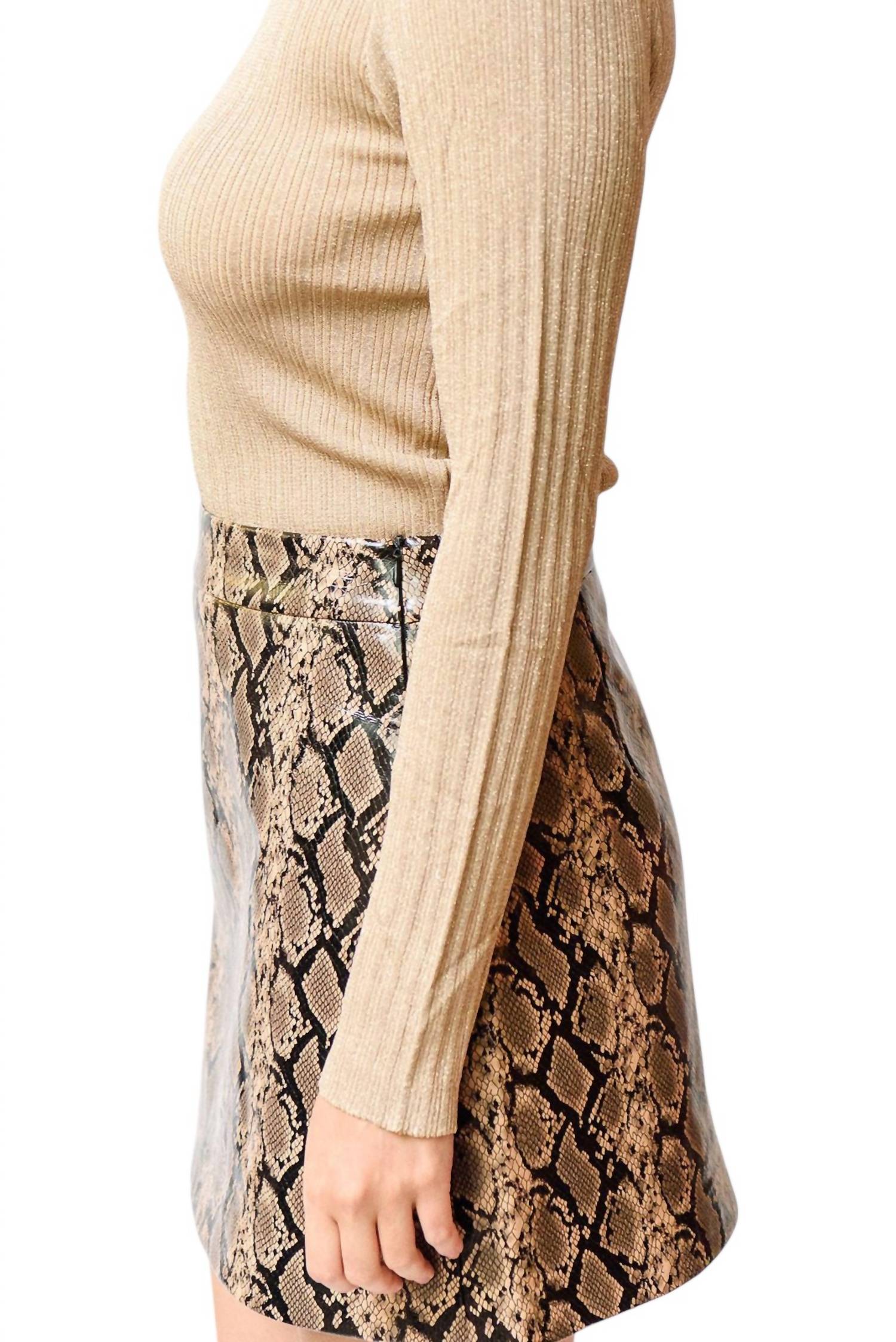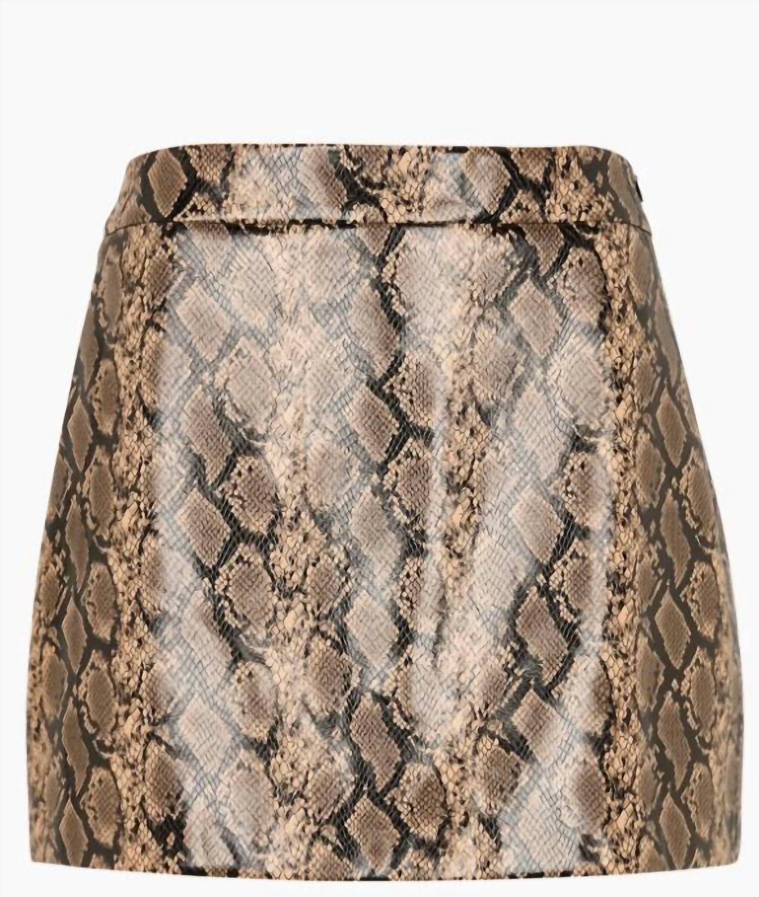 Playful mini-length skirt is made from 100% recycled polyester. Offering both sustainability and fashion-forward appeal. With a side zipper closure for a sleek, uninterrupted silhouette. Fully lined for added comfort and durability. Care instructions recommend ironing inside out to maintain its stunning snake print design.