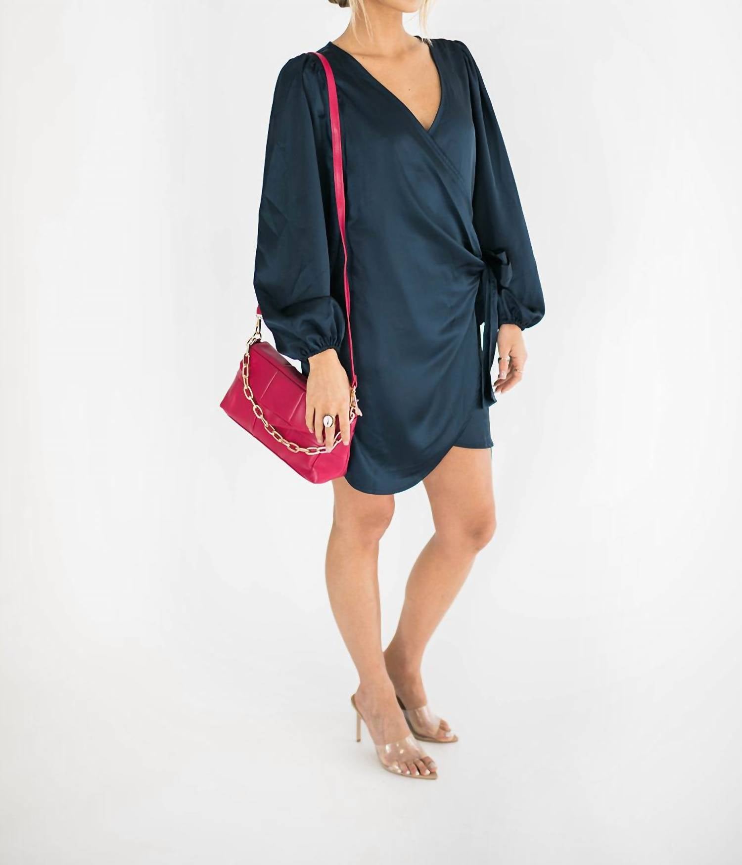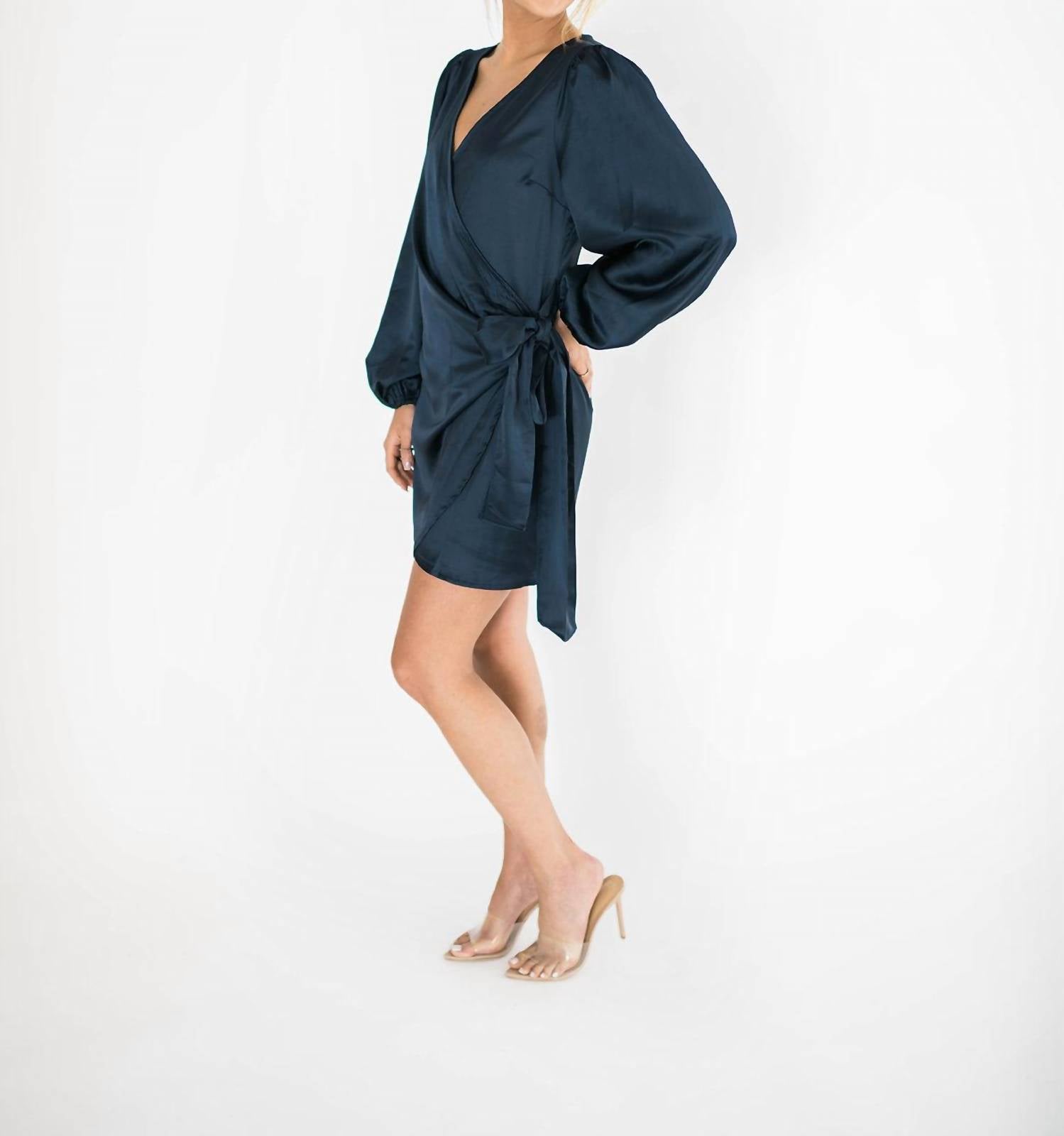 Introducing the Nova Wrap Dress by Falcon Park, a captivating piece perfect for any occasion. This mini dress showcases long balloon sleeves and a chic wrap bodice, all in a stunning satin blue fabric. With a V-neckline and a flattering tie waist, it features a clever hidden slim tie closure on the right and an adjustable button closure at the left waist underneath a sophisticated side bow. 100% Polyester. Length: 35" (Medium).