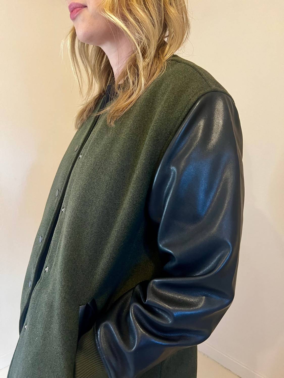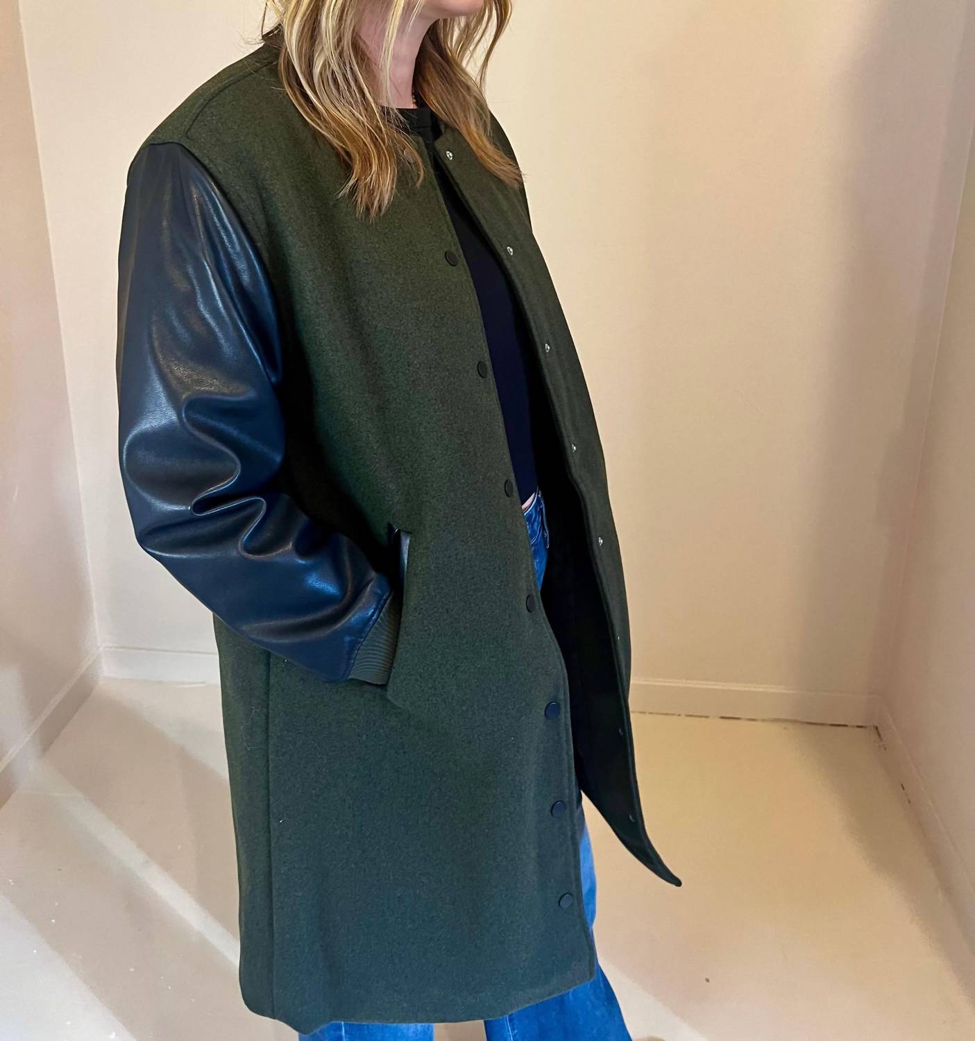 A timeless classic. You'll be reaching for this trench every season. Introducing the Walcott Coat by Blank, a chic trench coat that blends functionality with fashion. This green and black beauty boasts long sleeves with vegan leather arm sleeve details for an elevated look, while pockets offer practicality. Carefully crafted from a mix of 90% Polyester, 10% Rayon fleece, and 60% Polyurethane, 40% Polyester for the sleeves, this coat is a solid pattern piece perfect for layering. Care for this stylish trench by spot or wipe cleaning and lay flat to dry. Model sizes: Blonde model is 5'10" and wears a medium; Ally is 5'0" and wears an extra small.
