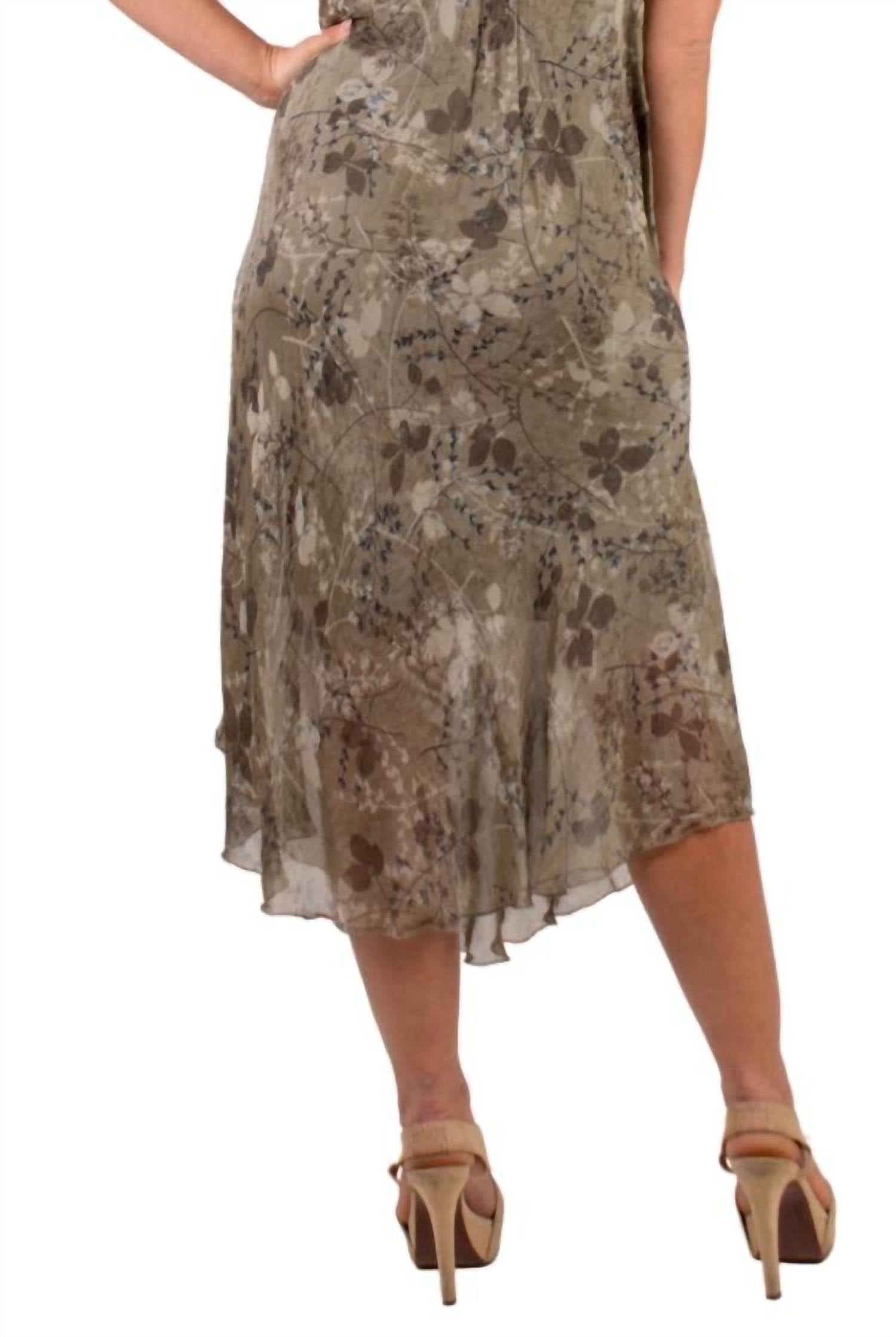 Pair with your favorite sandals for an effortlessly chic look. Presenting the Giardino Miele Midi Dress by GIGI MODA in a charming olive hue, perfect for casual summer outings or special occasions like Valentine's Day and anniversaries. This women's dress features delicate adjustable spaghetti straps and a shift silhouette, with a floral print that adds elegance to its design. Composed of a luxurious 30% silk exterior with a soft 70% viscose lining, it is crafted in Italy and offers an effortless pull-on closure. This one-size-fits-most dress, ideal for a scoop neckline look, is modeled by someone 5'8" in height.