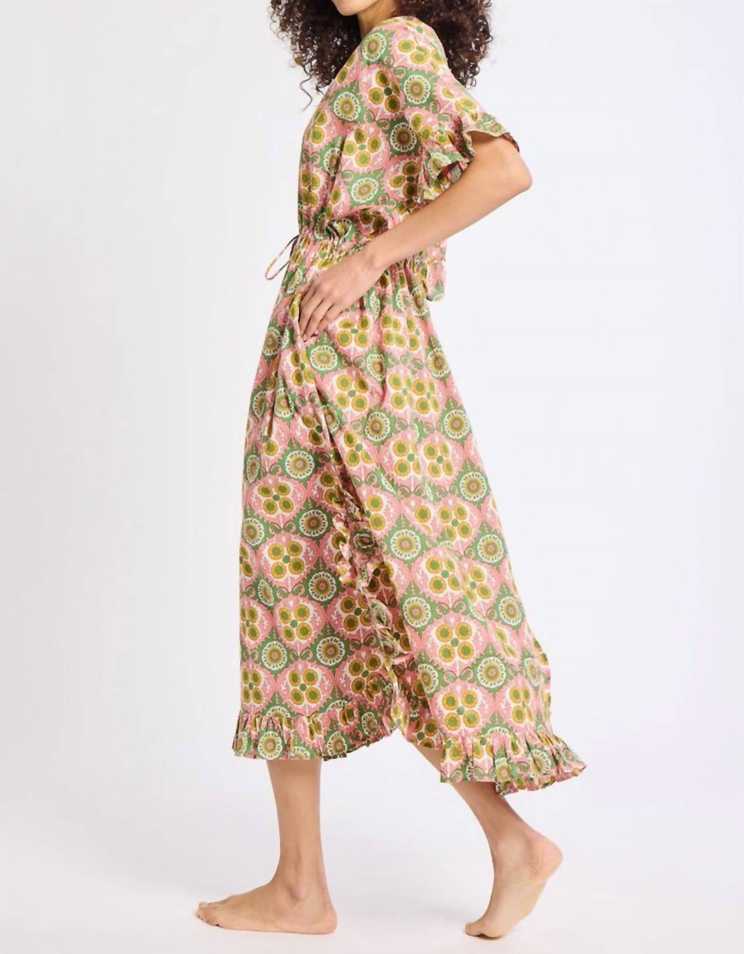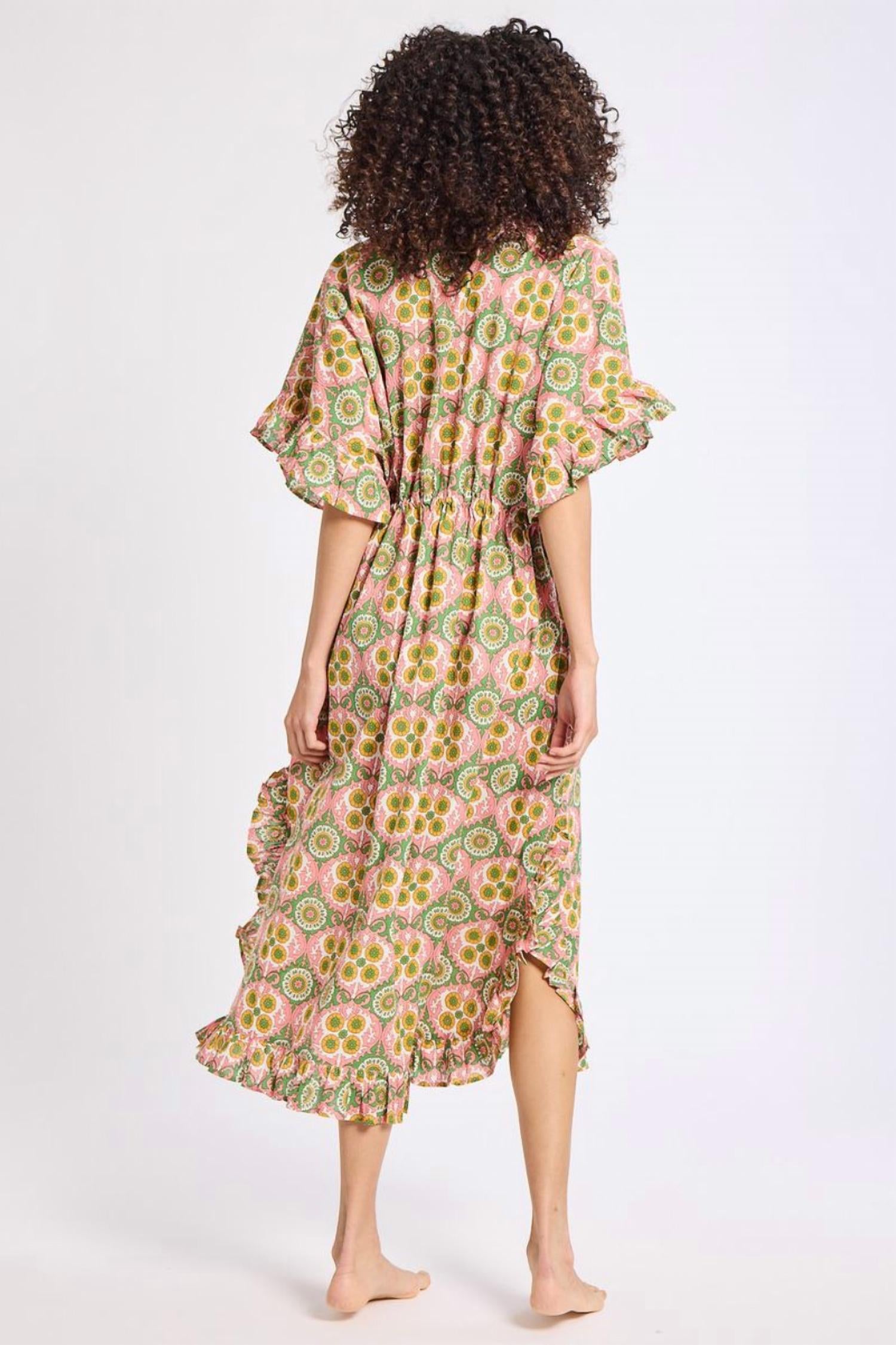 The perfect length dress does exist. Embrace Boho Chic with the Eden Caftan Midi Dress by MILLE, a patterned masterpiece in Yucatan. With its short sleeves, this dress showcases a V-neckline and a graceful A-line design, perfect for a summer escape. Crafted from 100% cotton, it features an adjustable tie closure with charming tassel details and boasts functional pockets for added convenience. Ideal for vacations and Easter celebrations, it promises comfort without stretch, and its pullover style with ruffled trims makes it effortlessly stylish.