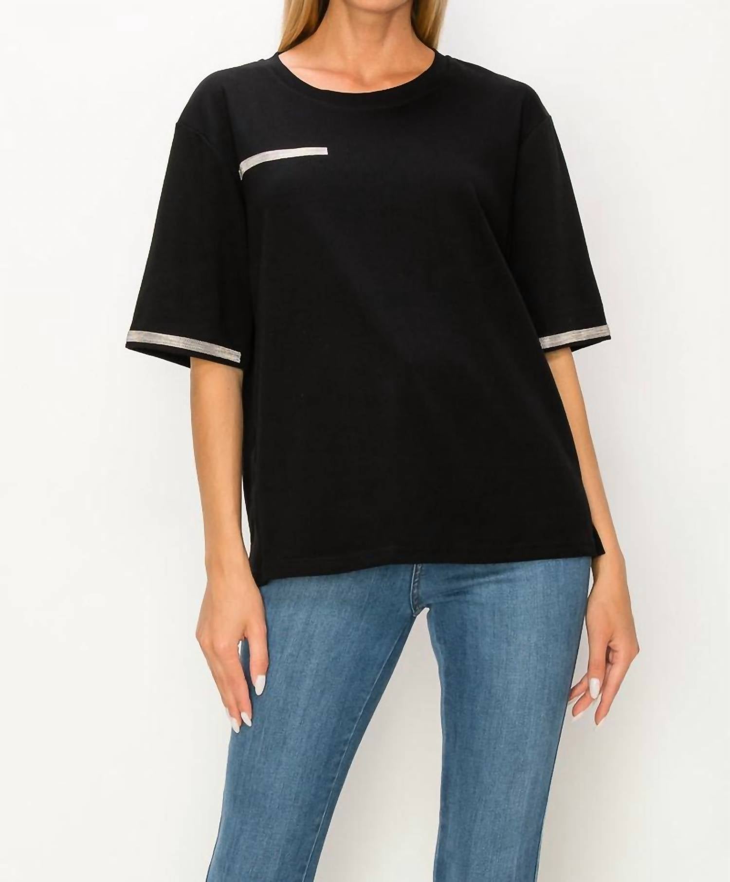 Look no further, you just found your perfect tee! Presenting the Roxi Top by JOH, your new wardrobe essential in classic black. This piece features short sleeves and a round neck, crafted from high-quality stretch pointe knit fabric for a relaxed fit. Adding a modern flair, the top is accented with metallic trim on the front and sleeve hems. Closure: Pull-on design, ideal for everyday wear.