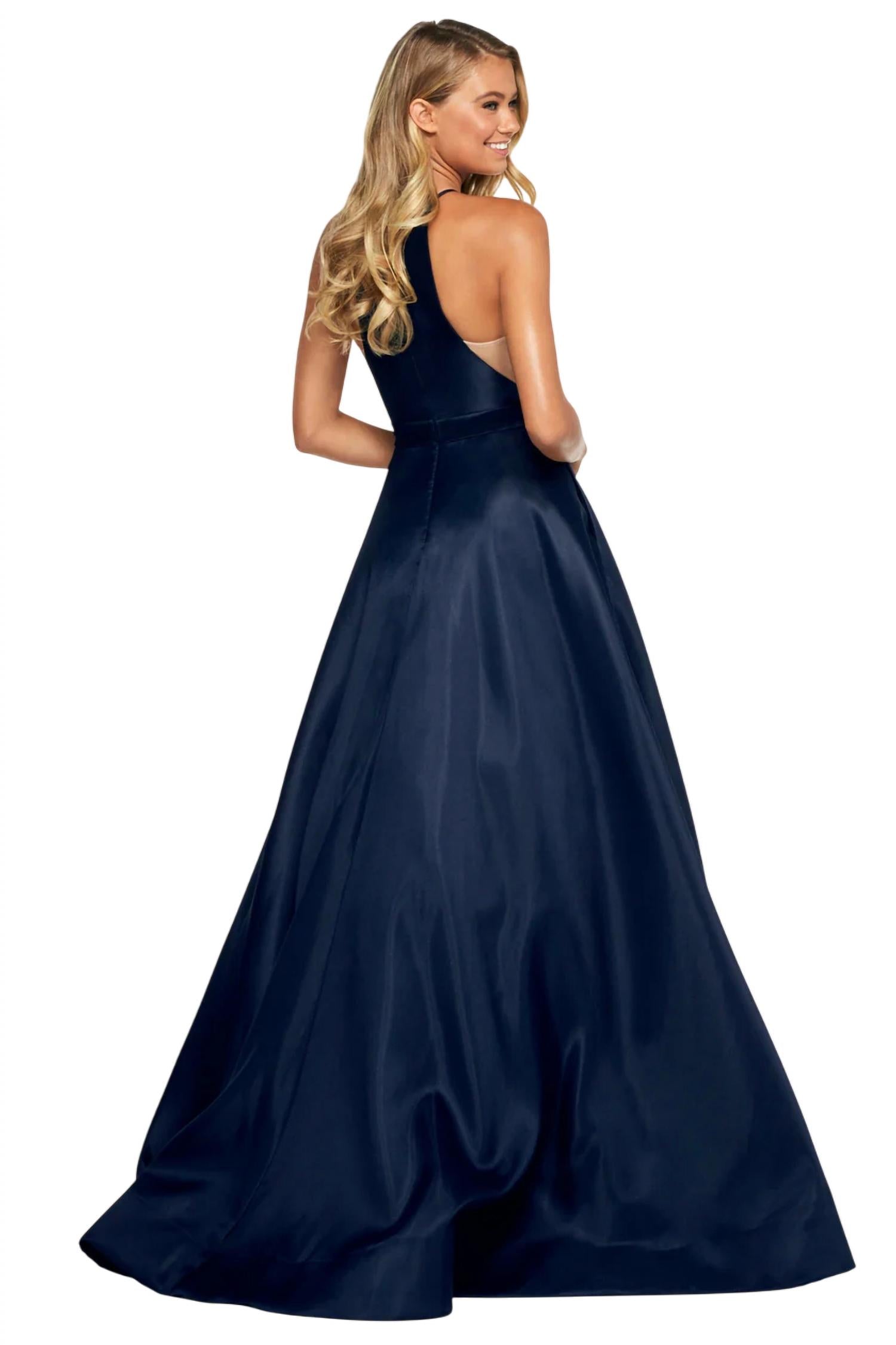 Features a Mikado A-line design with a high-cut halter neckline, complemented by a sleek belt featuring an embellished buckle. Floor-length dress.
