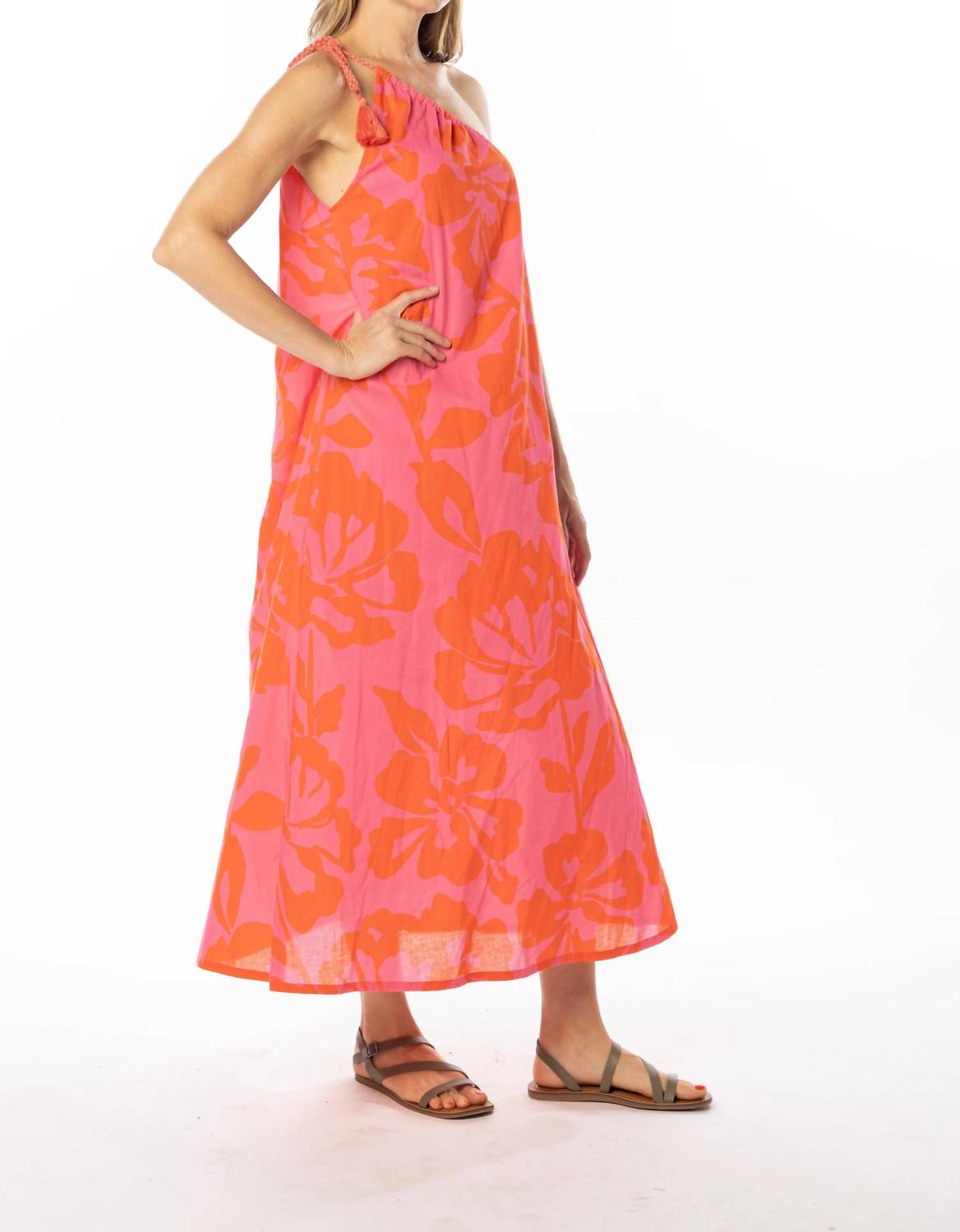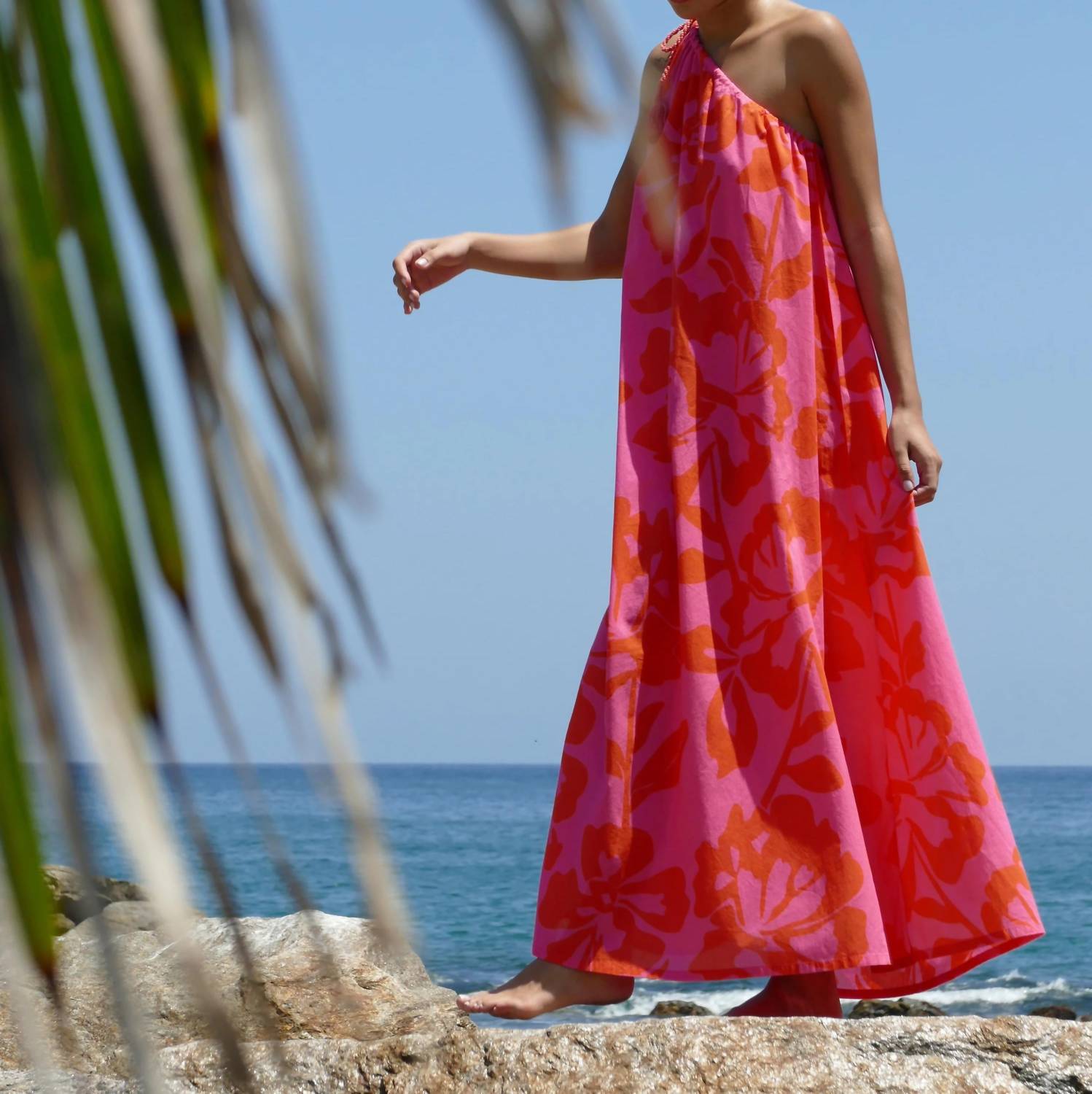 A maxi dress that is just as cute as it is comfortable. The Bindu Lydia One Shoulder Maxi Dress offers a flattering fit with its strapless design and kaftan silhouette. Made from pure cotton, this orange floral dress captures attention with its maximalist print, embodying a bold summer feel. Enjoy the ease of its pull-on closure and versatile off-the-shoulder neckline, perfect for Valentine's Day or vacation occasions. Care instructions recommend hand washing and laying flat to dry.